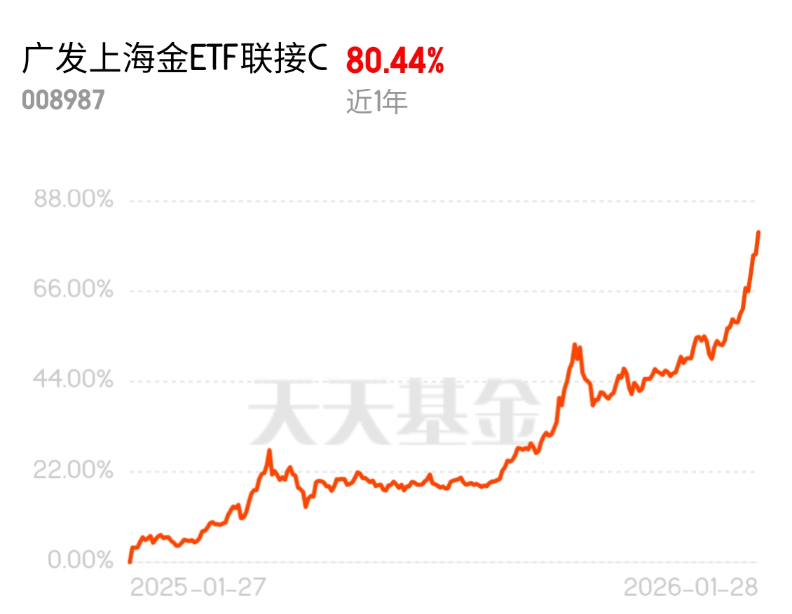 现在不仅是央行在买,连身边不炒股的朋友都在通过ETF扎堆进场,这种合力让金价涨得很有底气。我继续持有广发上海金C,看重的就是它跟涨上海金现货的纯度。在这个信用重构的时代,拿住实物资产的衍生品,比盯着数字跳动要有安全感得多。$广发上海金ETF联接C$