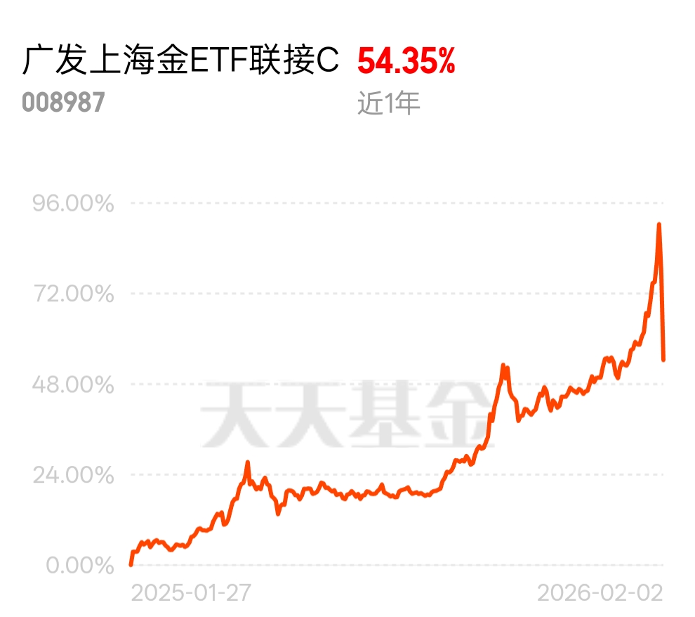 调高保证金这招挺高明,把那些跟风的短线客都洗出去了。金价回踩刚好给咱们这种长线玩家留了进场位。广发上海金C这种资产,跌下来就是为了摊薄成本,我昨天在恐慌点精准补仓,上海金昨天跌的比黄金多,今天肯定会补涨$广发上海金ETF联接C$