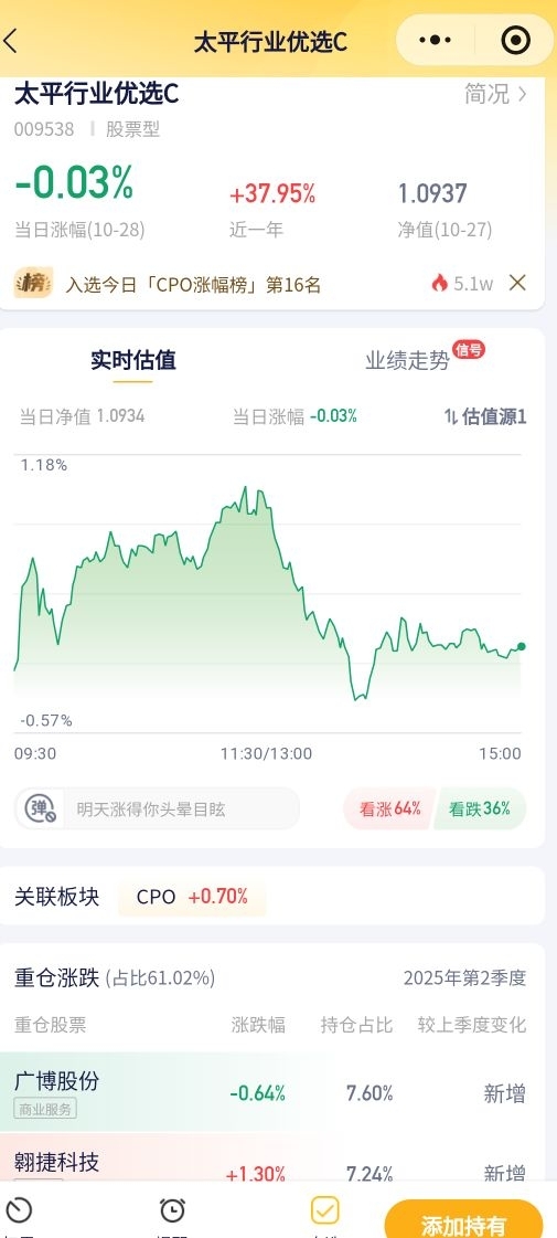 今天沪指跌0.22%,成交额少了近2000亿,资金有点谨慎。CPO靠行业利好涨得不错,福建、军工领涨,有色下跌。涨跌家数对半开,明天看量能,基金暂时不操作~