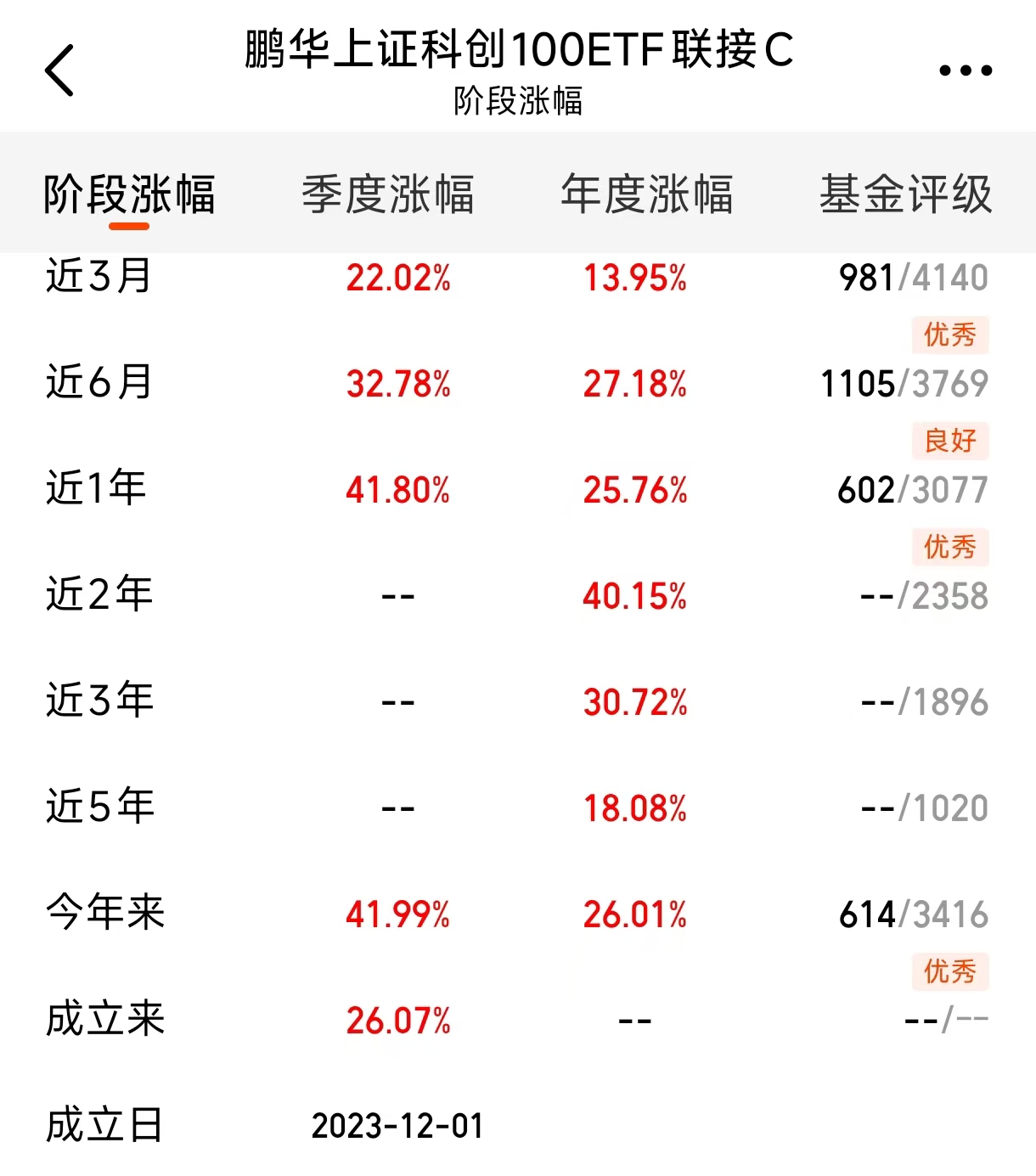 看看最近的市场,科创板块表现不错。$鹏华上证科创100ETF联接C$(019862)跟踪的指数包含了科创板块中多个行业的公司,比如半导体、医药生物、电力设备等,分布相对多元。在市场向好的背景下,这样的产品为把握板块机会提供了便利。#黄金创12年来最大单日跌幅!什么信号#