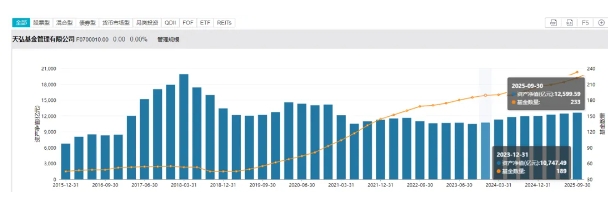 截至2025年三季度末,天弘基金是TOP基金公司里,唯一的一家ETF规模没上千亿的基金公司。