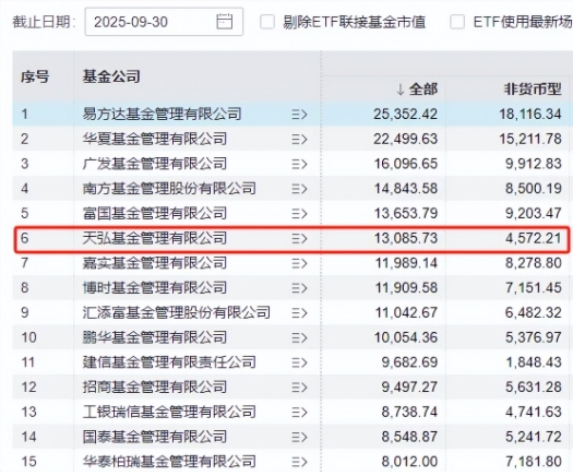 而最近刚上千亿规模的天弘基金,却不知是前十大里垫底的存在。