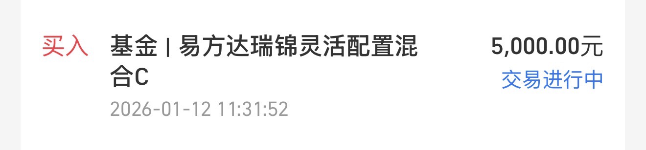 $易方达瑞锦混合C$ 加仓5000元。这段时间以来,权益市场的表现依然偏强势,债市也还不错,今天又是一个股债双收的天气,那么我顺势再加一笔易方达瑞锦灵活配置混合C,从持仓结构来看,它采用了债底防御+权益增厚的配置策略,信用债+利率债组合而成了较为平稳的底仓,少量的可转债增强组合弹性,23.74%的权益仓位布局了金融、资源、科技以及消费等多个行业,这种分散式的布局既能在市场震荡的时候缓冲部分回撤,又能在市场回暖的时候保留弹性空间。长期来看,它近一年收了705个蛋,收益表现还是不错的,今天我再递增5000元。