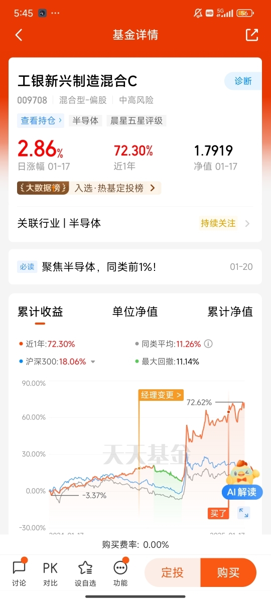 工银新兴制造混合C始终坚持长期投资理念,这也是其在震荡市场中表现强劲的重要原因。基金经理深知,新兴制造行业的发展具有长期性和阶段性,企业的成长需要时间的积累和市场的检验。因此,他们不会被短期市场波动所左右,而是着眼于企业的长期发展潜力,坚定持有优质资产。