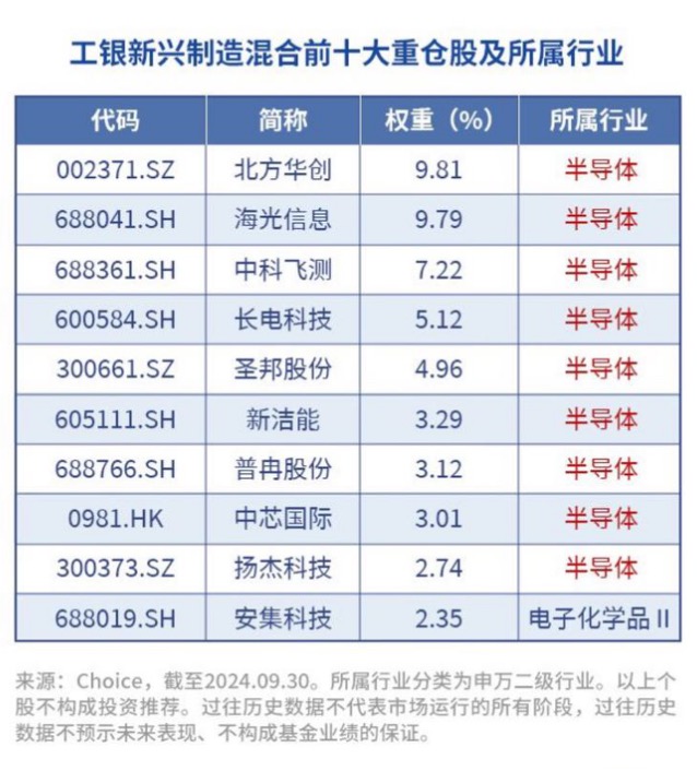 本基金积极把握产业转型升级中的投资机会,根据2024年三季度显示,前十大重仓聚焦半导体行业。