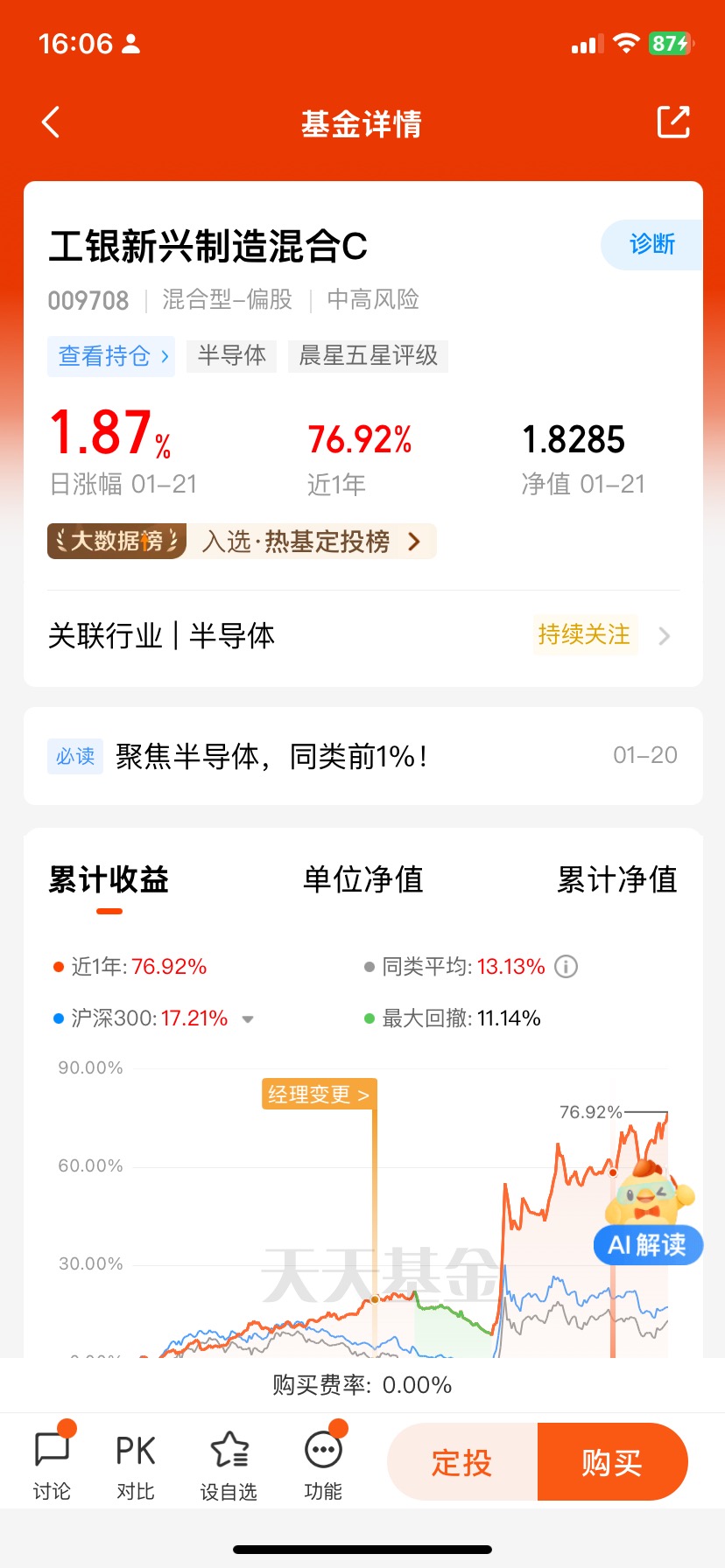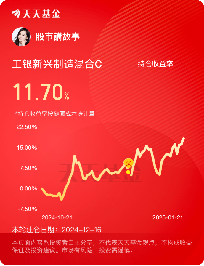#2025我的新年投资# 打卡第26天,今天A股市场普遍回调,半导体板块表现较好。$工银新兴制造混合C$ 近一年涨76.92%,在4101只同类基金中排名第6,表现非常优异!