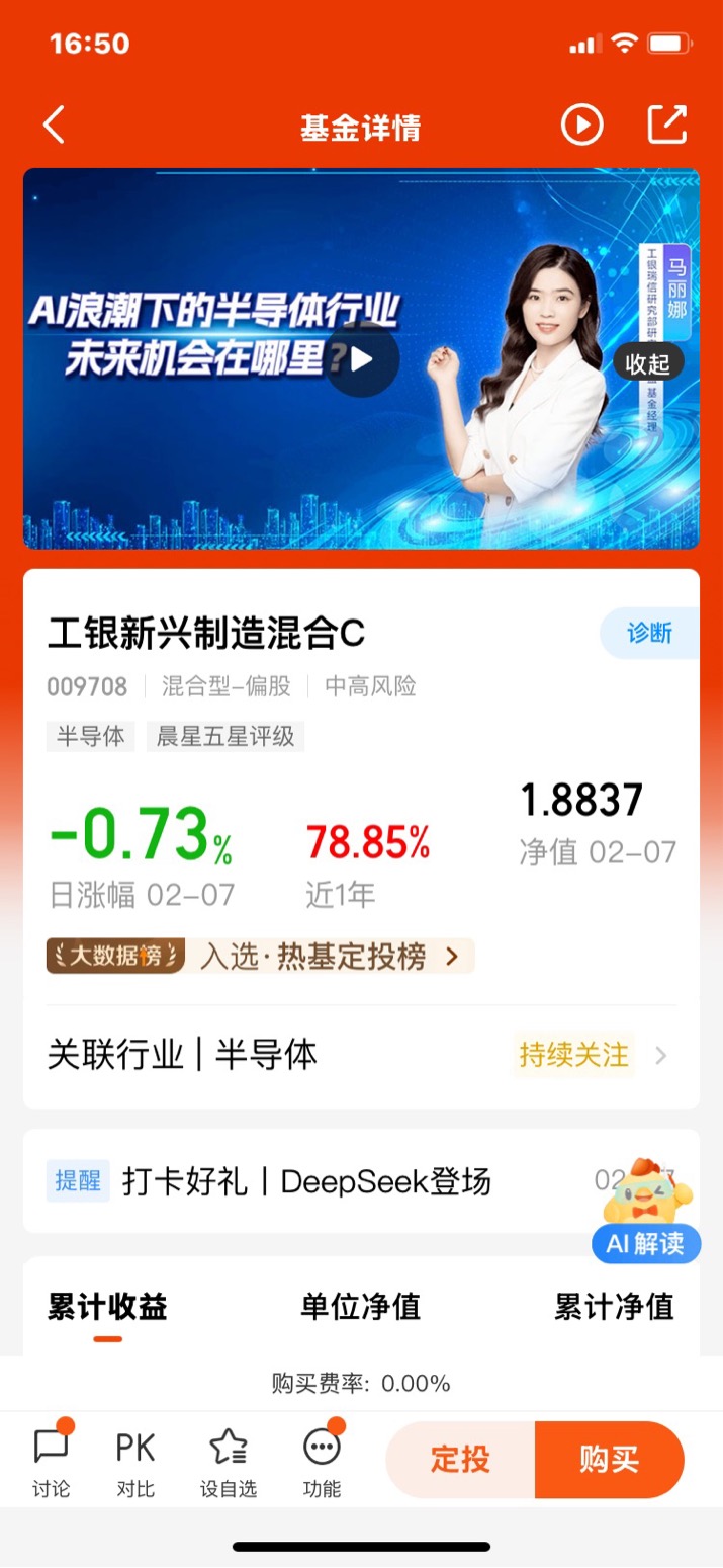 春节期间,DeepSeek的火爆不仅仅是一次技术的突破,更是对全球AI市场的一次洗牌。随着其技术的不断进步和应用领域的不断拓展,我们有理由相信,AI技术将更加深入地融入到我们的生活之中,为人类带来更多的便利和惊喜。作为投资者我们也应抓住这一历史机遇,关注相关产业链的发展,以获取更多的投资回报,如工银瑞信家的$工银新兴制造混合C$就是个不错的投资标的,感兴趣的小伙伴可直接点击链接了解一下。