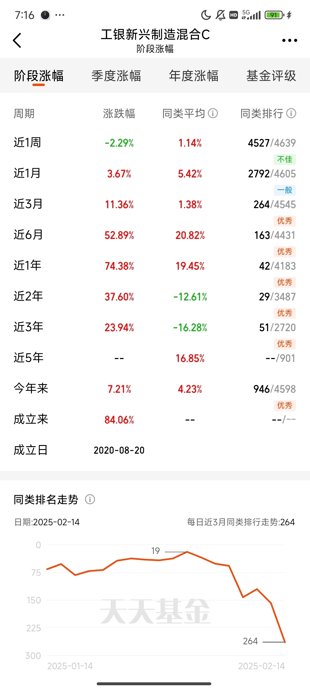 工银新兴制造混合C(009708)成立于2020年8月20日 ,属于混合型 - 偏股基金,由工银瑞信基金管理,基金经理为马丽娜。截至2024年12月31日,资产规模达5.90亿元。在2025年2月14日,面对科技股整体上扬,半导体却表现不佳的市场行情,其净值出现了0.1%的负增长。不过回顾过往一段时间,该基金业绩表现亮眼。例如在近1年时间里,其阶段涨幅达到79.12% ,大幅领先同类平均的18.75%以及沪深300的15.93%。在不同阶段的排名中,近1周、近3月、近6月、近1年在同类基金中的排名都较为靠前,展现出较强的盈利能力和增长潜力。