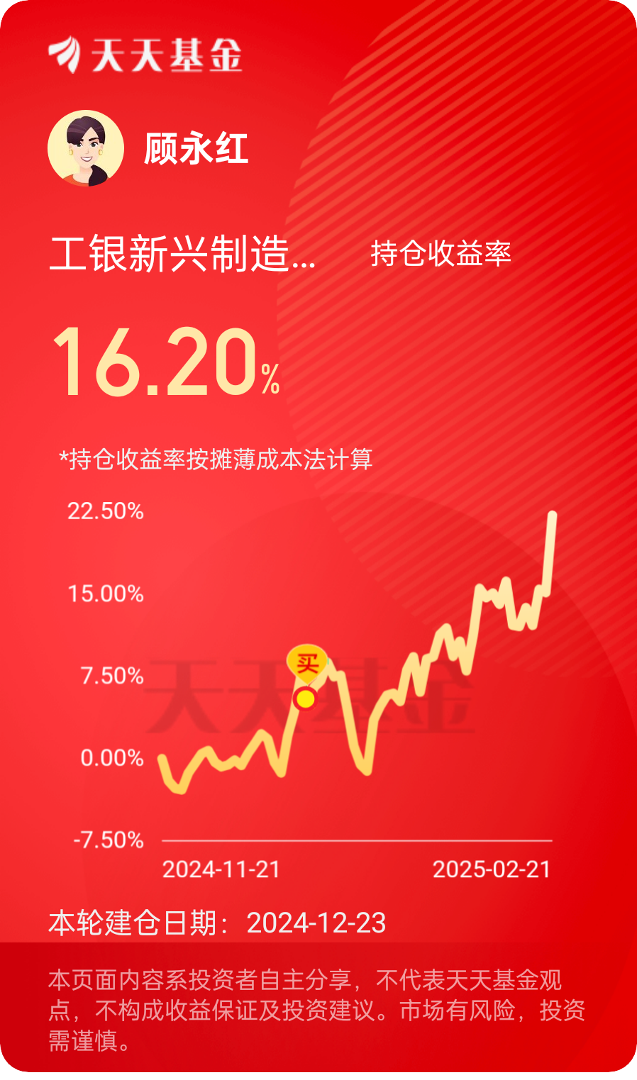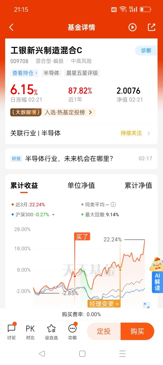 #晒一晒我的2月投资操作#2月投资,昨天A股单边上行,半导体涨幅居前!$工银新兴制造混合C$ 涨6.15%,近一年上涨87.82%,在4183只同类基金中排名20,表现非常优异!我是工银瑞信基金的长期忠实粉丝,目前定投11只工银瑞信基金产品,收益和体验都非常好!