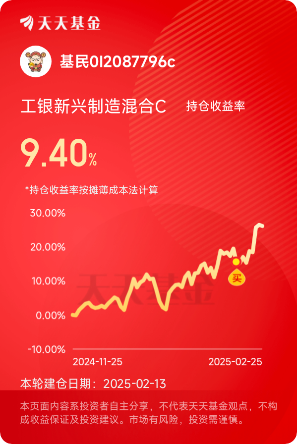 #晒一晒我的2月投资操作#2月投资打卡第十五天。2月投资关注科技,选择$工银新兴制造混合C$,现已布局上车。当前,以人工智能、大数据、云计算等为代表的新兴技术正加速与传统制造业融合,推动智能制造、绿色制造、服务型制造等新业态新模式蓬勃发展。我国作为制造业大国,正积极推进制造强国战略,政策红利持续释放,为新兴制造产业注入强劲动力。投资新兴制造,就是投资未来!