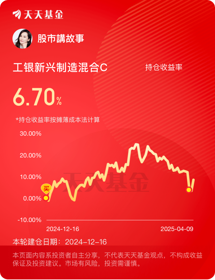 我非常信赖工银瑞信基金,长期定投、持有$工银新兴制造混合C$ 有$工银国证港股通科技ETF发起式联接C$ $工银可转债债券$ $工银黄金ETF联接E$ 等10只基金产品,获得了非常好的收益回报和持有体验!将会继续配置、坚定持有工银瑞信基金产品,相信会有满意的长期投资回报!@工银瑞信基金 #晒收益#