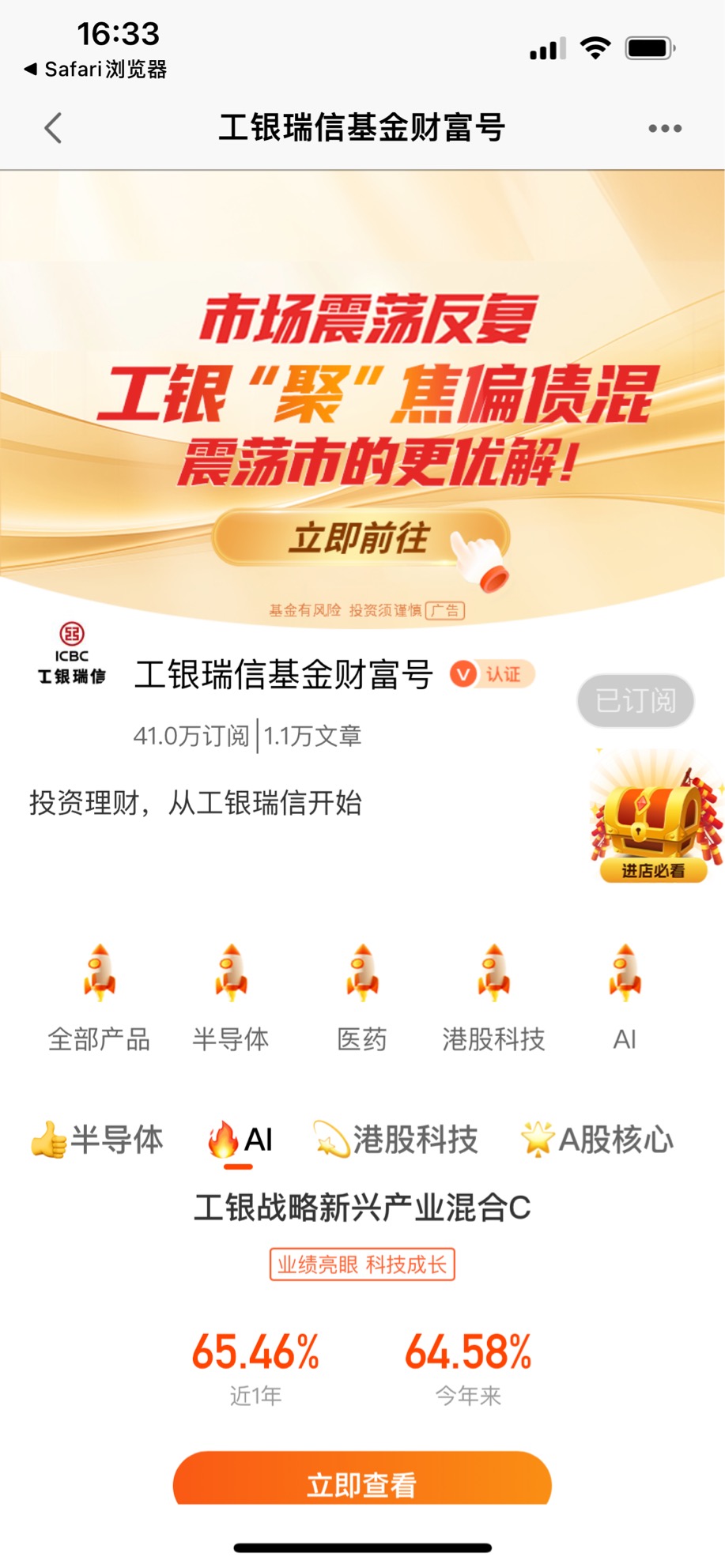 先说说大背景,科技赛道早已不是“概念炒作”的代名词,而是实实在在撑起经济增长的核心引擎。从半导体国产替代的加速推进,到AI技术从实验室走向商业化落地,再到港股科技的估值修复,以及TMT领域的数字化转型,每一个细分方向都藏着巨大的成长空间。工银瑞信这五只基金精准覆盖了半导体、港股科技、AI、科技+周期、TMT等科技核心赛道,形成了“单点突破+全面覆盖”的布局体系,刚好契合了科技产业的发展脉络。更重要的是,工银瑞信作为2005年成立的老牌基金公司,管理规模超8580亿,拥有87位基金经理、管理488只基金,这样的实力背景,让旗下基金的运作更有保障,也让投资者能更放心地把钱交给他们打理。就比如我自己,我持有工银瑞信基金公司旗下的产品多达十一只,这还不算以前获利了结的,这就足以证明我对工银瑞信基金的认可和信赖,不然不会配置如此多的产品,可以毫不夸张的说,我持有的工银瑞信基金,足可以形成一个投资闭环了!!!(我自己持有的工银瑞信基金产品会在文末展示出来)