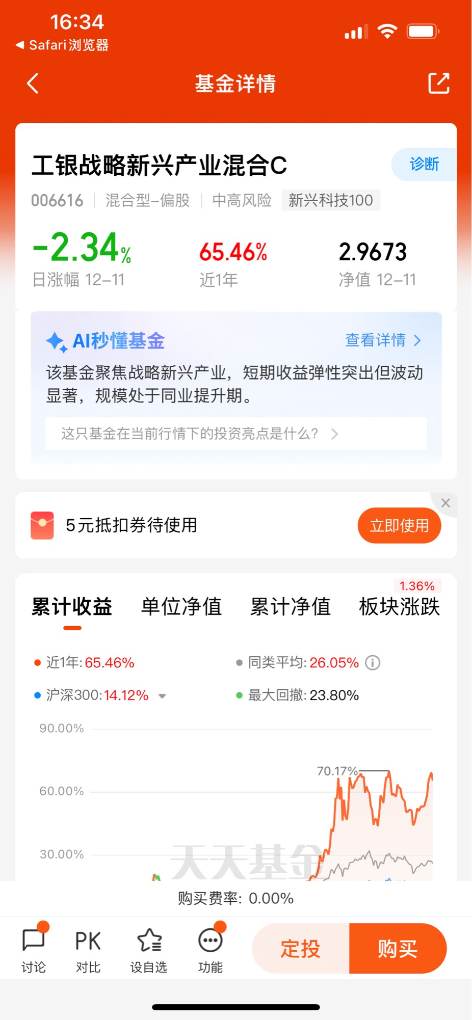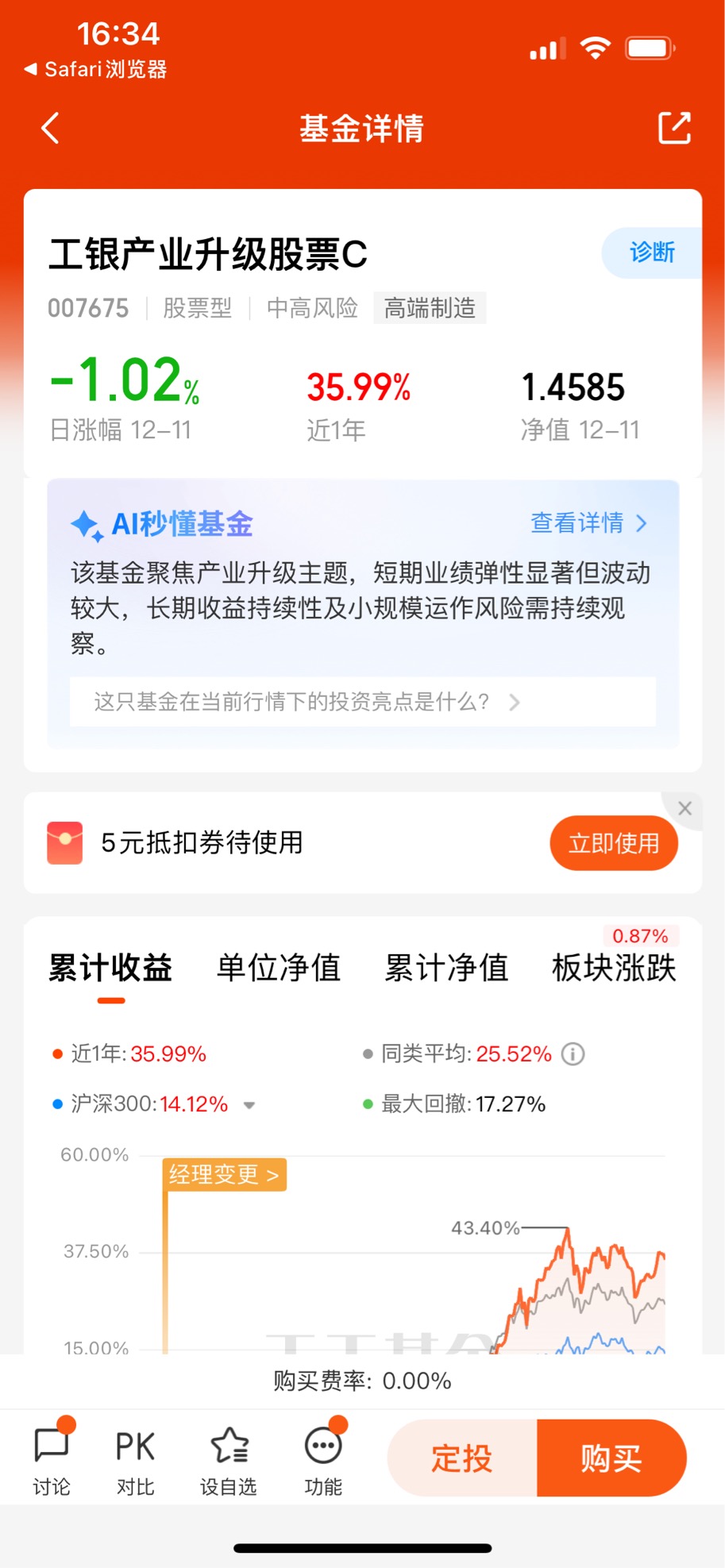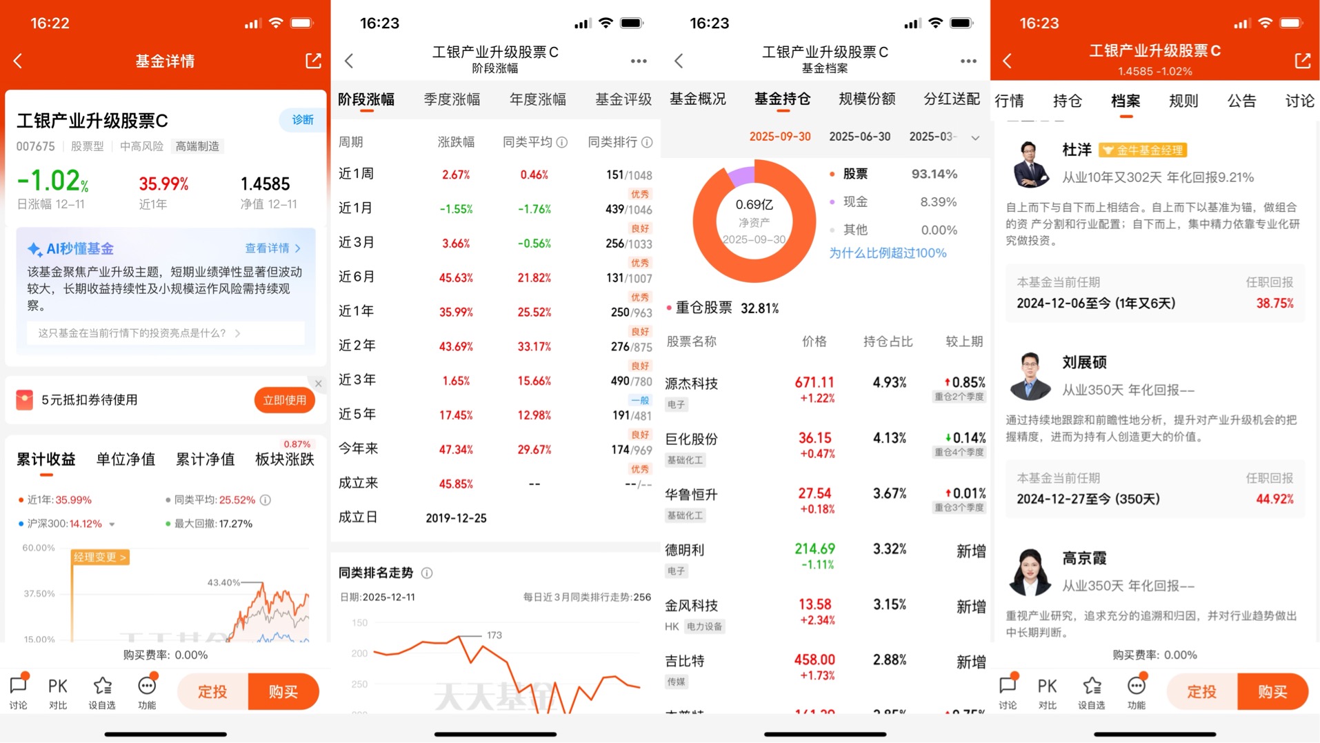 然后是工银产业升级股票C,这只基金是科技+周期布局的“稳健之选”。它成立于2019年12月25日,由杜洋、刘展硕、高京霞联合管理,截至2025年9月30日,C类份额成立以来净值增长率为51.47%,近一年涨幅34.98%。这只基金的特色在于“科技+周期”的融合布局,既关注源杰科技这类科技企业,也布局了巨化股份、华鲁恒升等周期领域的优质标的,分散化配置降低了单一赛道的波动风险。科技赛道虽然成长性强,但波动大,而周期股在经济复苏阶段能提供稳定的收益,两者结合让基金的表现更稳健。比如2024年科技赛道回调时,这只基金因为配置了周期股,净值回调幅度远小于纯科技基金。杜洋有十年投资经验,年化回报9.21%,刘展硕和高京霞也在产业升级领域有深入研究,三人协同管理,能在科技和周期之间找到平衡。对于想要布局科技赛道,但又担心波动太大的保守型投资者来说,这只基金再合适不过,既能分享科技成长的收益,又能通过周期股降低组合风险。