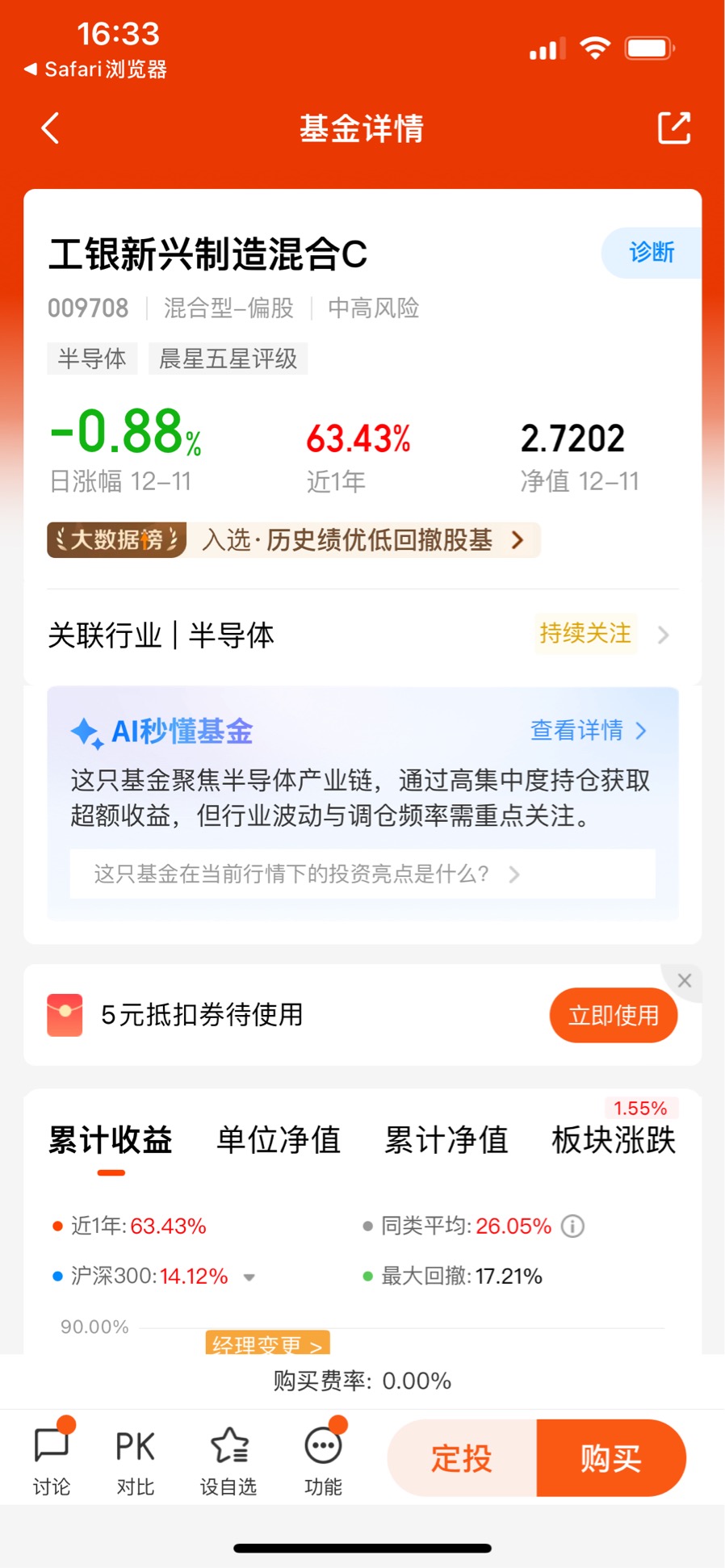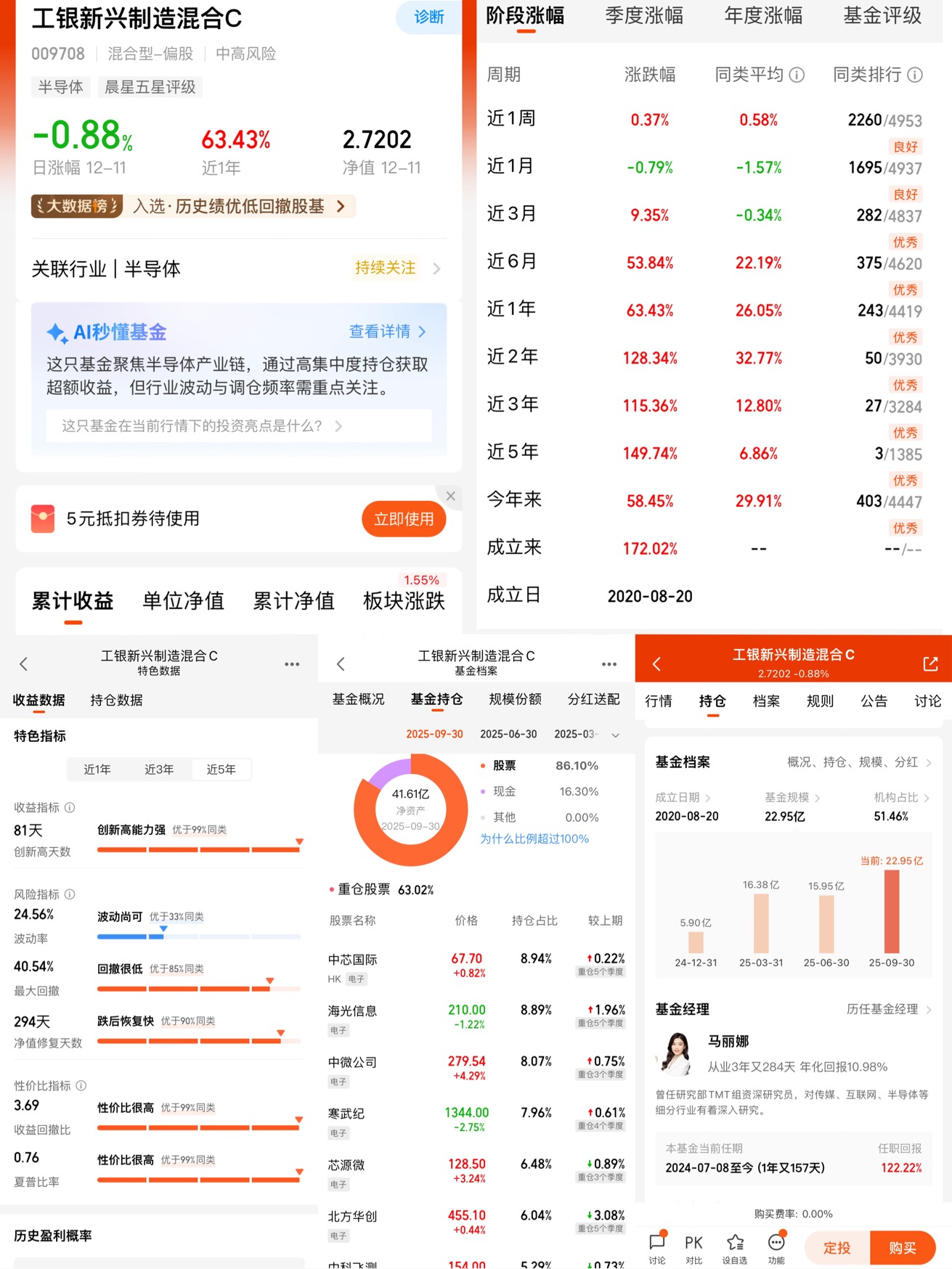 先看工银新兴制造混合C,这只基金绝对是布局半导体赛道的“王牌”。它成立于2020年8月20日,马丽娜自2024年7月8日接手管理,截至2025年9月30日,C类份额成立以来净值增长率高达190.20%,近一年涨幅也达到106.62%,在同类开放式基金里排名19/1951,这样的业绩放在半导体赛道里,绝对是第一梯队的水平。半导体是科技产业的“基石”,现在国内半导体设备国产化率才35%,未来替代空间大得很,而这只基金就是冲着半导体国产替代的核心机会去的。它的前十大重仓股牢牢锁定中芯国际、海光信息、中微公司这些半导体产业链的核心企业,持仓占比超60%,集中度高且精准踩中了国产替代的主线。马丽娜本身有多年TMT研究经验,对半导体行业的技术迭代和产业趋势摸得透,比如在成熟制程芯片量产、光刻机零部件突破这些关键节点上,她总能提前布局相关企业。虽然半导体赛道波动大,比如2024年该基金曾出现过净值回调,但长期来看,随着国产替代的深入,业绩兑现的确定性越来越强,近一年106.62%的涨幅也印证了其选股能力。对想要抓住半导体国产替代红利的投资者来说,这只基金就是最直接的工具,毕竟普通人很难精准筛选半导体企业,而专业基金经理能帮我们避开技术壁垒高、业绩兑现难的标的,聚焦真正有潜力的龙头。