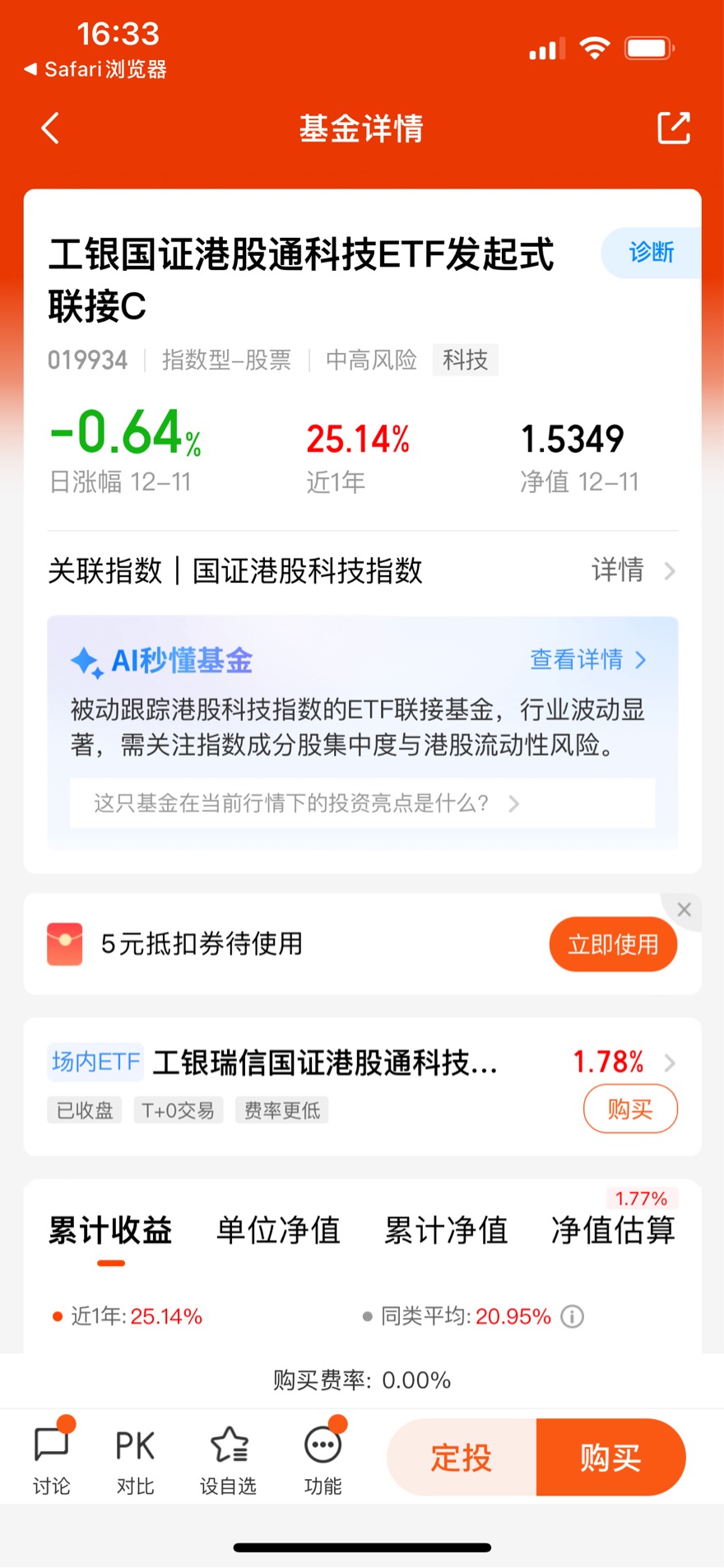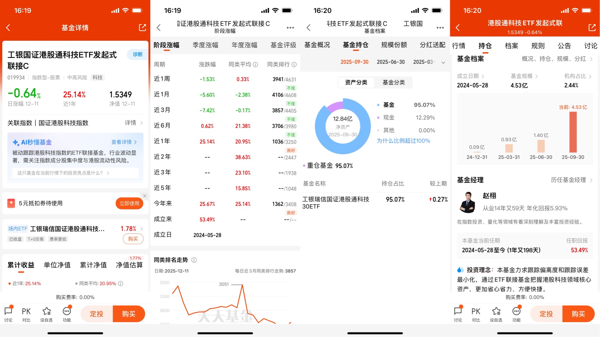 再看工银国证港股通科技ETF发起式联接C,这是布局港股科技的“利器”。这只基金成立于2024年5月28日,由赵栩管理,截至2025年9月30日,成立以来净值增长率达80.46%,近一年涨幅50.27%,同期业绩比较基准收益率是58.17%,几乎跑平基准,作为一只指数联接基金,这样的跟踪效果已经相当优秀。港股科技此前因为各种因素跌了好几年,估值跌到了历史低位,恒生科技指数市盈率一度只有十几倍,而现在南向资金持续流入、美联储降息带来流动性宽松,叠加腾讯、小米等龙头企业的回购潮,港股科技的估值修复行情已经启动。这只基金跟踪国证港股通科技指数,覆盖了阿里、腾讯、小米等港股科技龙头,还纳入了一些硬科技领军者,既能分享互联网巨头的估值修复,也能把握港股硬科技企业的成长机会。赵栩在指数化投资领域经验丰富,管理这只基金时能精准跟踪指数,避免了主动管理的择时风险,而且ETF联接基金的费率更低,适合普通投资者长期持有。对于想布局港股科技,但又不想花精力研究个股的人来说,这只基金就是“懒人神器”,能低成本、高效率地分享港股科技的复苏红利。