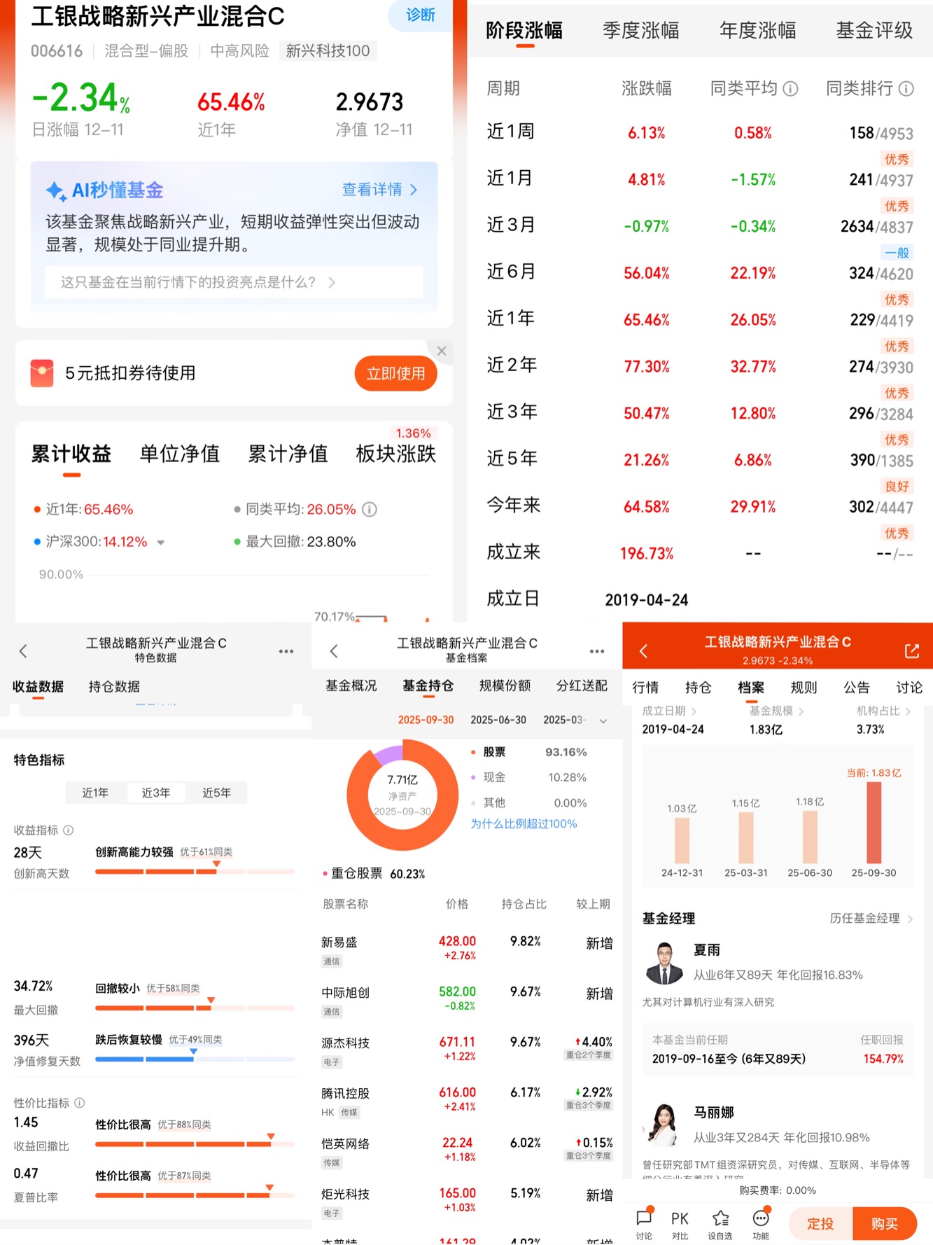 最后是工银战略新兴产业混合C,这是覆盖TMT全赛道的“老牌劲旅”。它成立于2019年4月24日,由夏雨、马丽娜联合管理,截至2025年9月30日,C类份额成立以来净值增长率高达187.89%,近一年涨幅65.46%,同期业绩比较基准收益率是15.13%,大幅跑赢基准。TMT涵盖通信、传媒、计算机等领域,是科技技术落地的核心载体,而这只基金就精准布局了TMT全产业链,前十大重仓股包括新易盛、中际旭创等通信龙头,腾讯控股等互联网科技企业,还有兆龙科技这类AI应用端标的,实现了从技术突破到产业应用的全链条覆盖。夏雨有八年证券从业经验,对计算机行业研究深入,马丽娜则擅长TMT领域,两人协同管理,让基金在科技赛道的布局更有深度和广度。比如在5G建设加速时,加仓通信设备企业;在AI应用落地时,布局传媒、计算机相关标的。这只基金成立六年多来,经历了科技赛道的多次牛熊转换,依然能保持稳定的收益,足以证明其管理能力的优秀。对于想要全面布局TMT赛道、追求长期稳健收益的投资者来说,这只基金是不二之选。