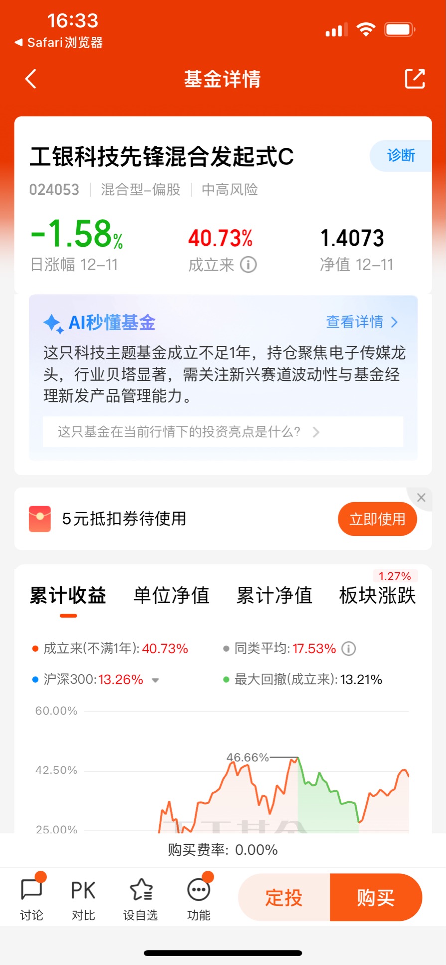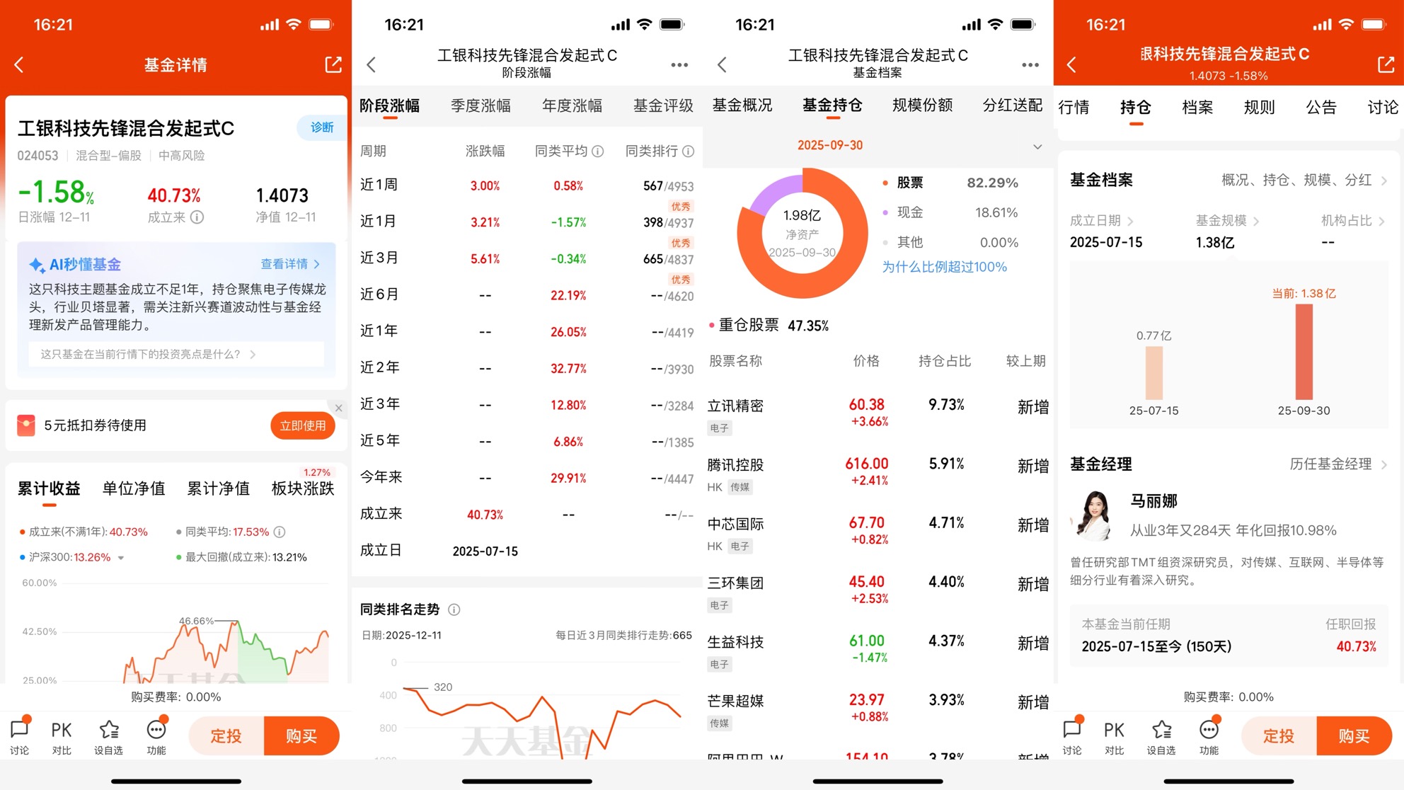 接下来是工银科技先锋混合发起式C,这只基金是捕捉AI与科技前沿机会的“新锐力量”。它成立于2025年7月15日,同样由马丽娜管理,虽然成立时间不长,但截至目前净值增长率已经达到40.73%,爆发力十足。AI是未来十年最具想象空间的赛道,现在已经从概念炒作进入商业落地阶段,算力、应用端的需求持续爆发,而这只基金就精准聚焦AI产业链,同时兼顾科技龙头的布局。它的前十大重仓股既有立讯精密、腾讯控股这样的科技巨头,也有中芯国际、生益科技等硬科技标的,还有芒果超媒这类AI应用端企业,实现了“算力+应用+龙头”的多元化布局。马丽娜凭借对TMT和AI领域的深度研究,在基金运作中灵活调整持仓,比如在AI算力需求爆发时加仓光模块、服务器相关企业,在应用端落地时布局AI影视、虚拟人相关标的。虽然这只基金成立时间短,但从短期表现来看,已经展现出对科技前沿趋势的敏锐把握,适合想要参与AI等新兴科技赛道、追求高成长的投资者。需要注意的是,这类基金波动会比较大,但高风险往往伴随着高收益,只要能承受短期波动,长期来看大概率能吃到AI产业发展的红利。