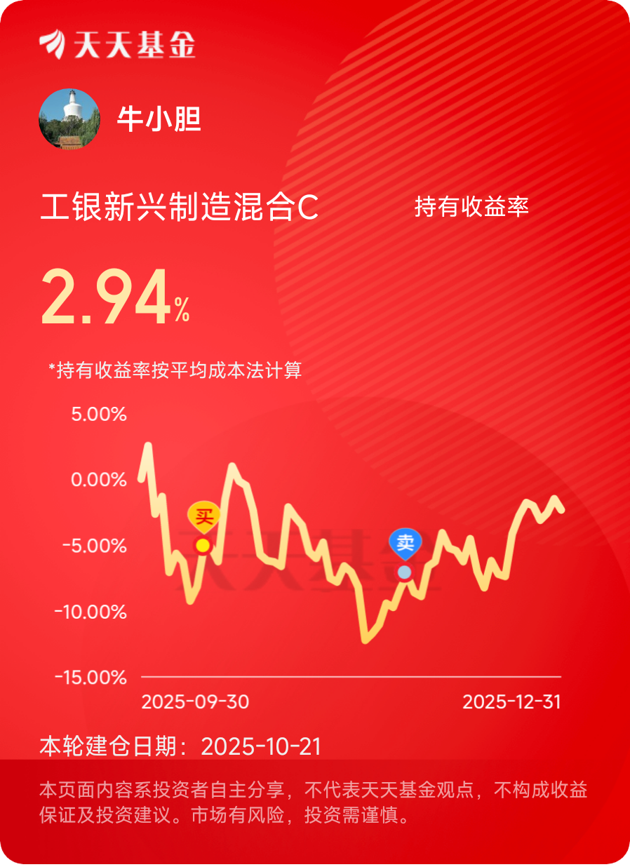 我不会因为介入时机较晚而焦虑,也不会因为短期的净值波动而乱了阵脚。2026年,我会坚定持有这只工银新兴制造混合C,不盲目加仓,不轻易割肉,与时间为伍,与优质标的共生。