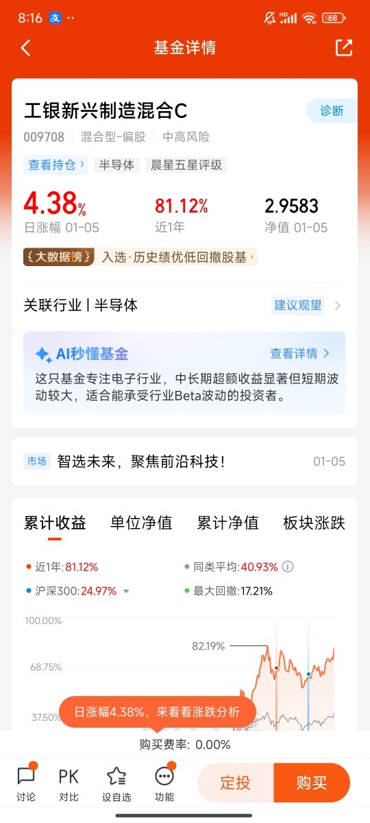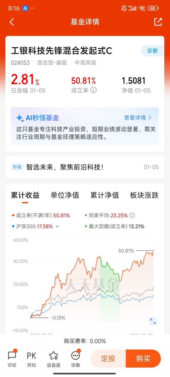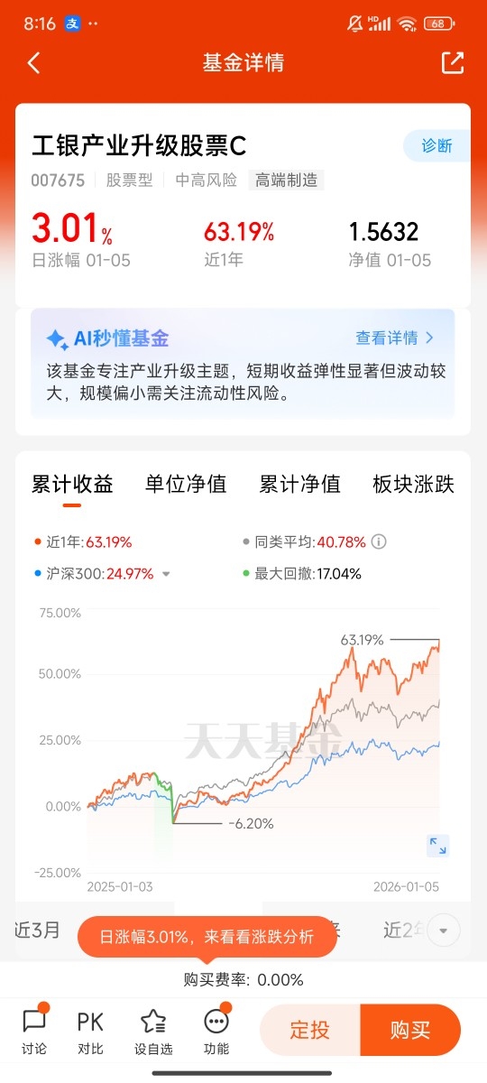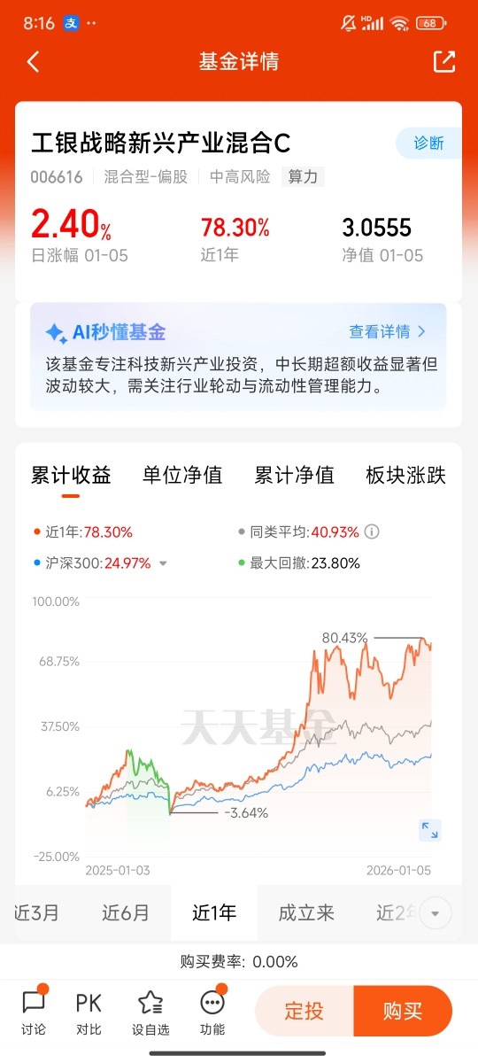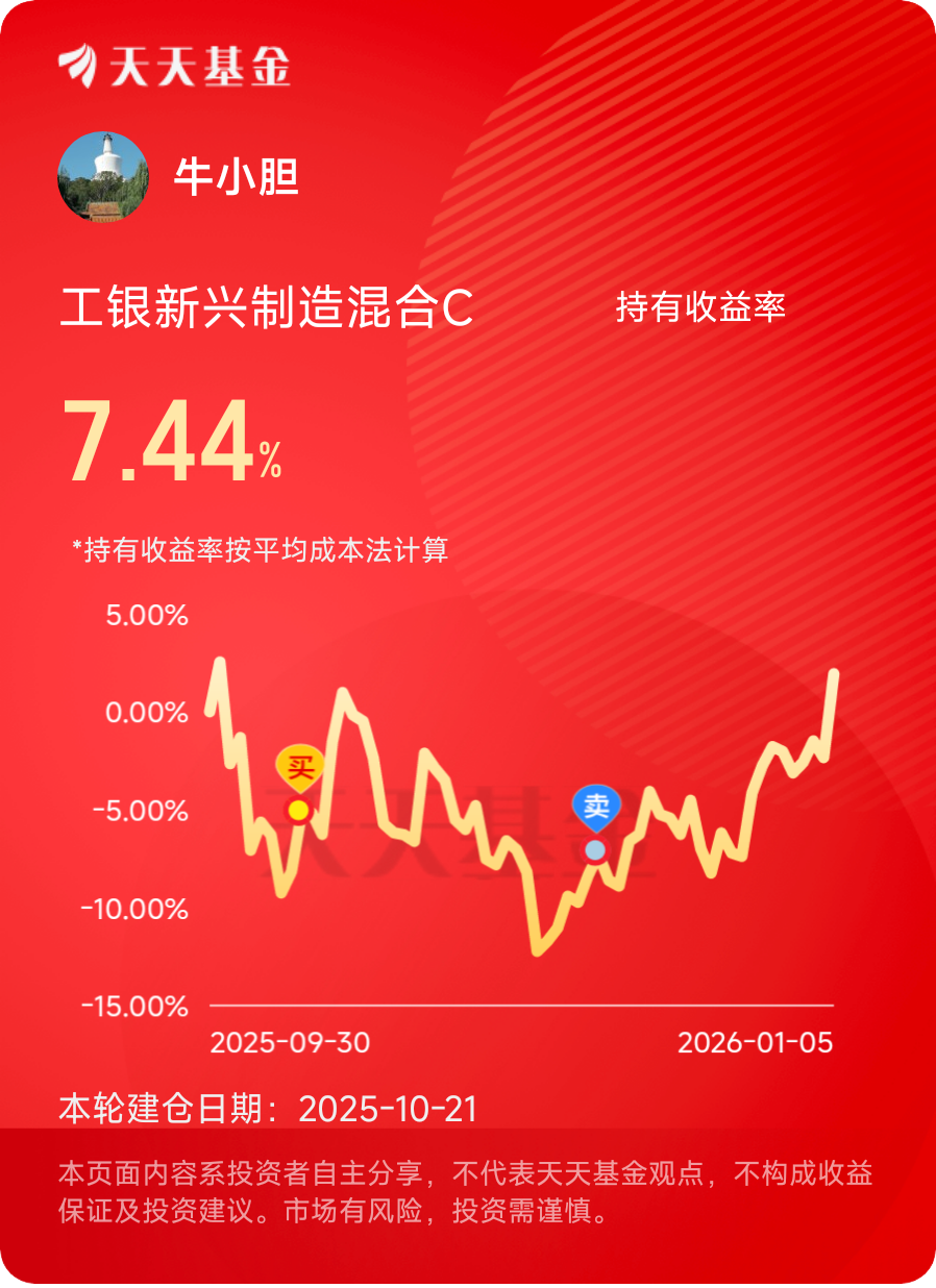 新年第一天的大涨,不仅是一份丰厚的投资回报,更是对2026年科技赛道投资的信心提振。工银新兴制造混合C的亮眼表现,让我更加坚定了长期持有优质科技制造主题基金的信念。从目前的市场环境和行业趋势来看,科技自立自强、制造业转型升级仍是长期主线,AI应用落地、半导体国产替代、智能驾驶等领域仍有广阔的成长空间。