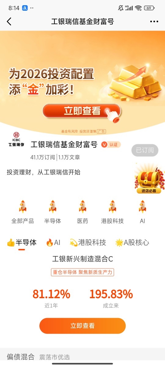 关注这只基金许久,当初决定入手,正是看中它紧扣“新兴制造”这一核心赛道,尤其在科技与制造深度融合的趋势下,其投资方向精准踩中了时代风口。这只基金的投资范围聚焦于具有先进技术、核心竞争力和创新能力的制造业领域,涵盖了半导体、人工智能、智能装备等多个高景气赛道,而这些领域恰好是2026年开年市场的核心发力点。从持仓结构来看,基金重点布局了半导体产业链的优质标的,从芯片设计、制造到设备、测试等各个环节都有覆盖,这种全面且深入的布局,让它在科技板块普涨的行情中充分享受了行业红利。