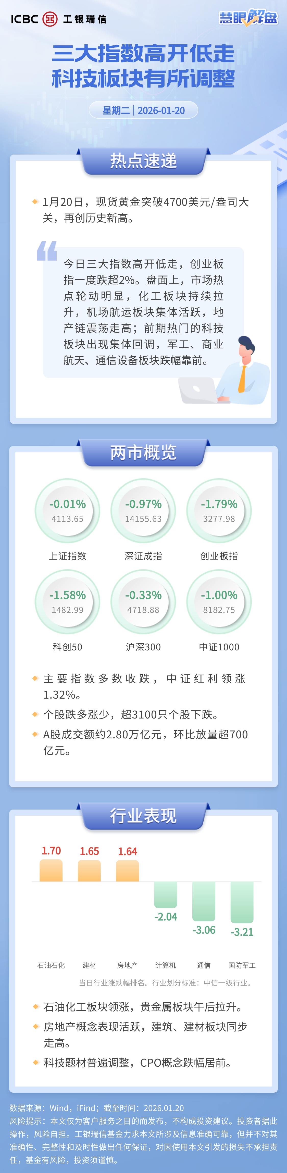今日三大指数高开低走,创业板指一度跌超2%。