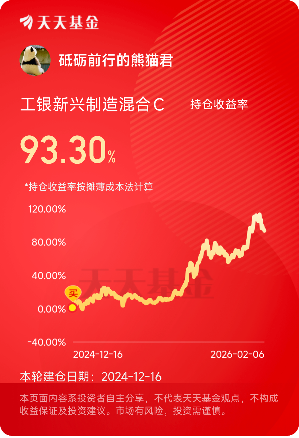 写在前面:大家好,我是熊猫君,一个在投资圈摸爬滚打多年的老基民。今天想和大家聊聊我手里拿得最久、也最让我安心的基金——工银新兴制造混合C(009708)。这只基金就像我的“心头好”,从2024年12月买入至今,收益已经达到了93%。今天,我将和大家深度剖析这只基金,聊聊我为什么看好它,以及我对2026年投资和AI赛道的真实看法。