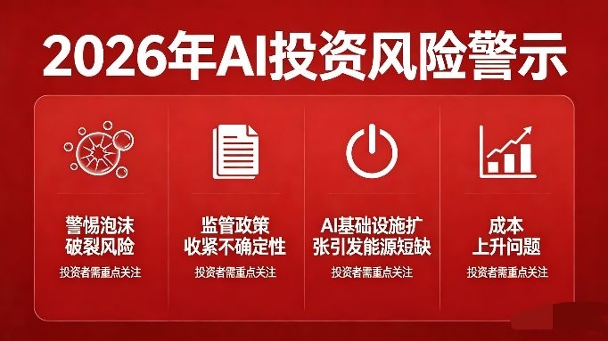 AI投资并非一帆风顺。2026年,我们需要警惕AI泡沫破裂的风险,以及监管政策收紧带来的不确定性。此外,AI基础设施的扩张可能带来能源短缺和成本上升的问题,这也是投资者需要关注的风险点。
