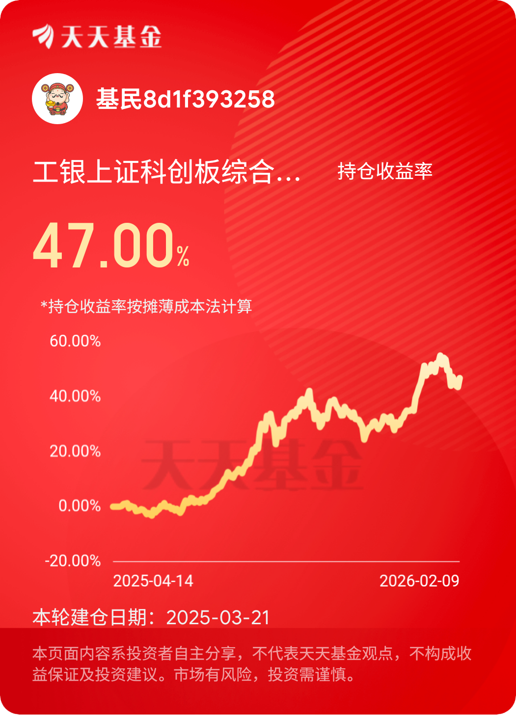 作为工银瑞信多只基金的长期持有人,手中不仅持有固收+、红利类产品,更将多只科技板块基金纳入核心配置,从$工银新兴制造混合C$到$工银国证港股通科技ETF发起式联接C$,再到$工银上证科创板综合价格ETF联接C$ ,一路持有下来,不仅收获了超出预期的投资收益,更对工银瑞信在科技赛道的投研实力有了深刻的体会,这份投资体验,让我对工银瑞信的信赖愈发坚定。