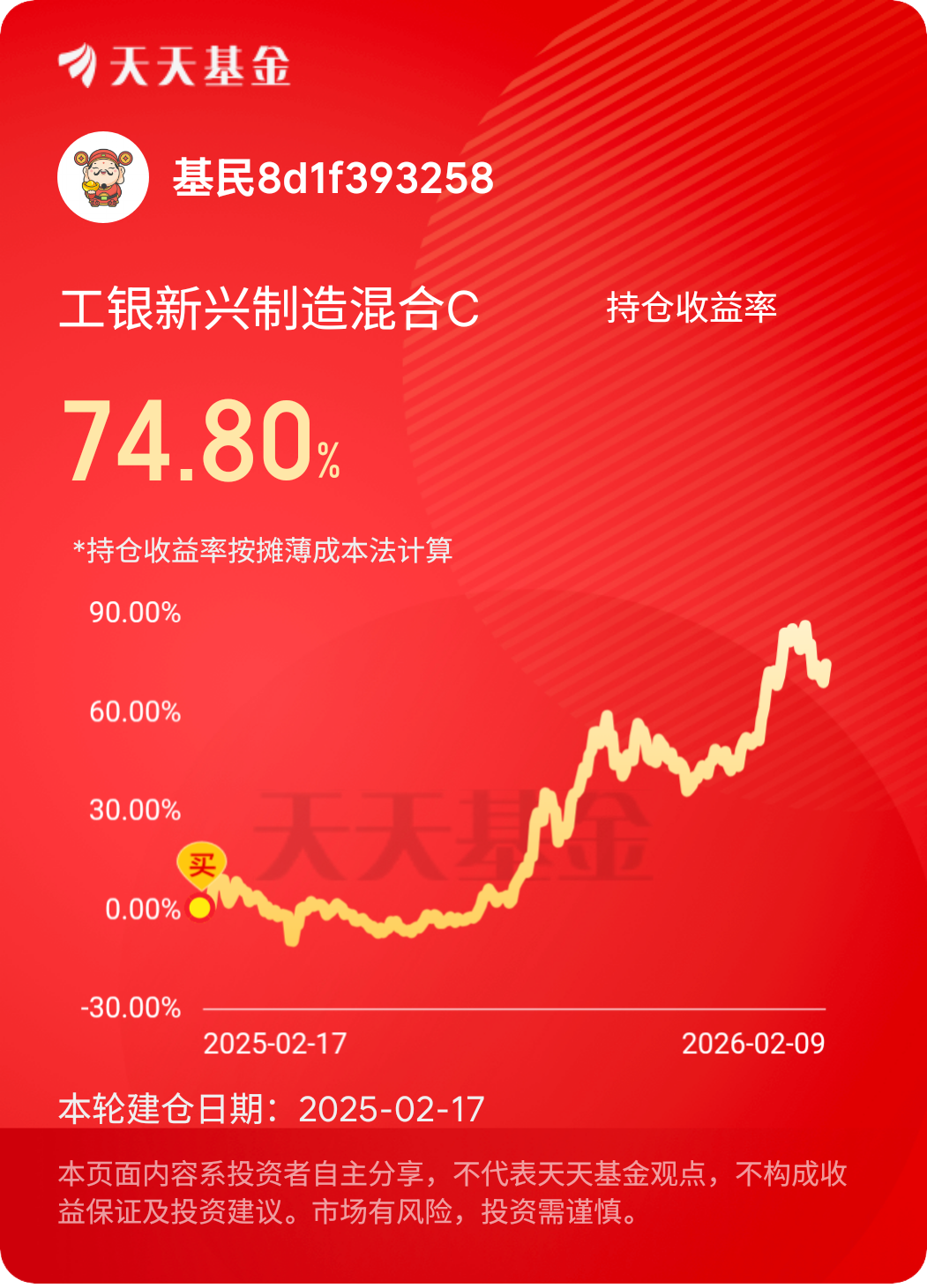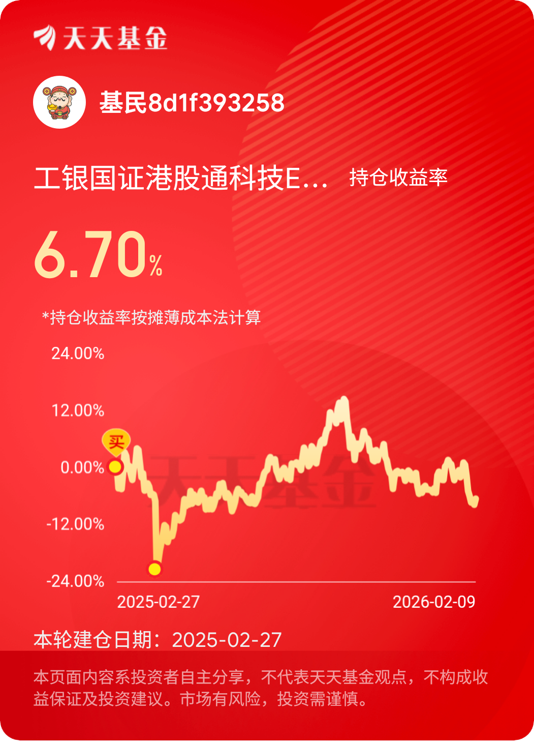 作为一名坚定的长期主义投资者,我始终相信时间的力量,基金投资的核心就是与优秀的产品并肩,用时间换空间。对于手中的工银瑞信科技板块基金,我从未有过短期持有的想法,反而在市场调整时坚持定投,逢低加仓,用闲钱投资,克服恐惧与贪婪,做到“手中有基,心中无基”。定投的方式让我平滑了市场波动的风险,逢低加仓则让我在科技板块的低位积累了更多筹码,而长期持有的耐心,也让我收获了时间带来的复利回报。