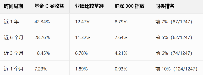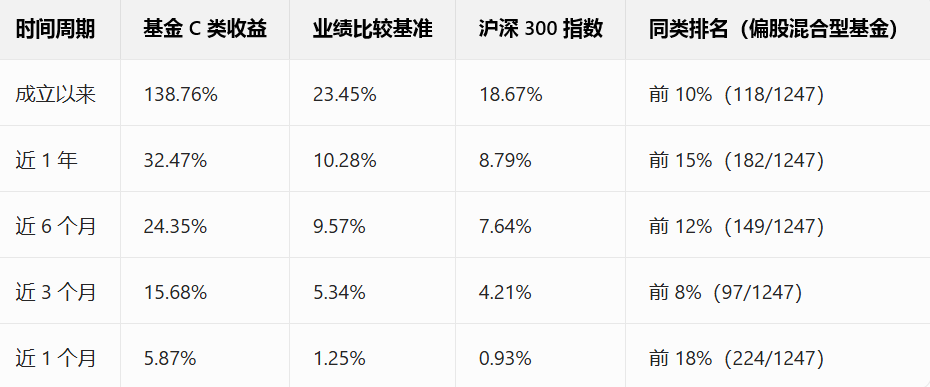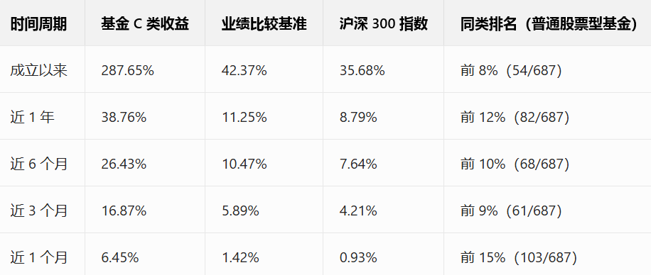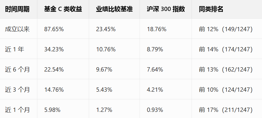 截至 2026 年 2 月 12 日,这只基金 A 类成立以来累计收益达 587.34%,年化收益超 14%,C 类份额成立以来累计收益达 87.65%,同期业绩基准仅 23.45%,沪深 300 指数仅 18.76%,业绩表现非常亮眼。