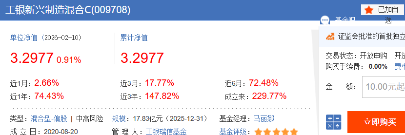 先唠第一只,也是我个人非常喜欢的一只 —— 工银新兴制造混合 C,这只基金是专门抓硬科技制造的王牌,完美契合 2026 年 AI 硬件、高端制造爆发的主线行情。
