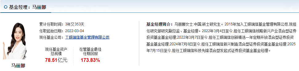 管理团队背景:基金经理马丽娜拥有10年证券从业经验,2015年加入工银瑞信,现任研究部研究副总监,专注于科技制造领域投资。她自2024年7月起管理该基金,任职期间回报率达131.53%,远超同类平均水平。马丽娜的投资风格以"产业思维"著称,注重产业趋势和公司技术壁垒,擅长通过动态调整策略把握科技成长红利。