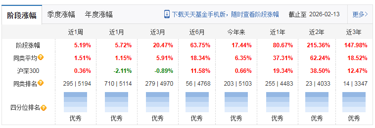 工银新兴制造混合C成立以来业绩表现优异,截至2026年2月13日,基金累计净值达3.3286元,成立以来累计收益率达232.86%。近一年净值增长率达80.67%,近五年收益率在偏股型基金(股票上下限60%-95%)中排名同类第一(1/202),展现出强劲的市场表现。