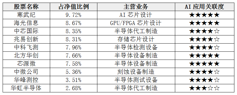 基金持仓呈现出"高度聚焦、集中度高"的特点,前十大重仓股合计占比超过70%,这种高集中度策略体现了基金经理对半导体和AI硬件产业链的深度研究和坚定看好。从持仓结构看,基金主要布局在AI产业链的上游硬件支撑环节,包括AI芯片设计(寒武纪、海光信息)、半导体代工制造(中芯国际、华虹半导体)、半导体设备(北方华创、芯源微、中微公司)和检测设备(中科飞测)等。