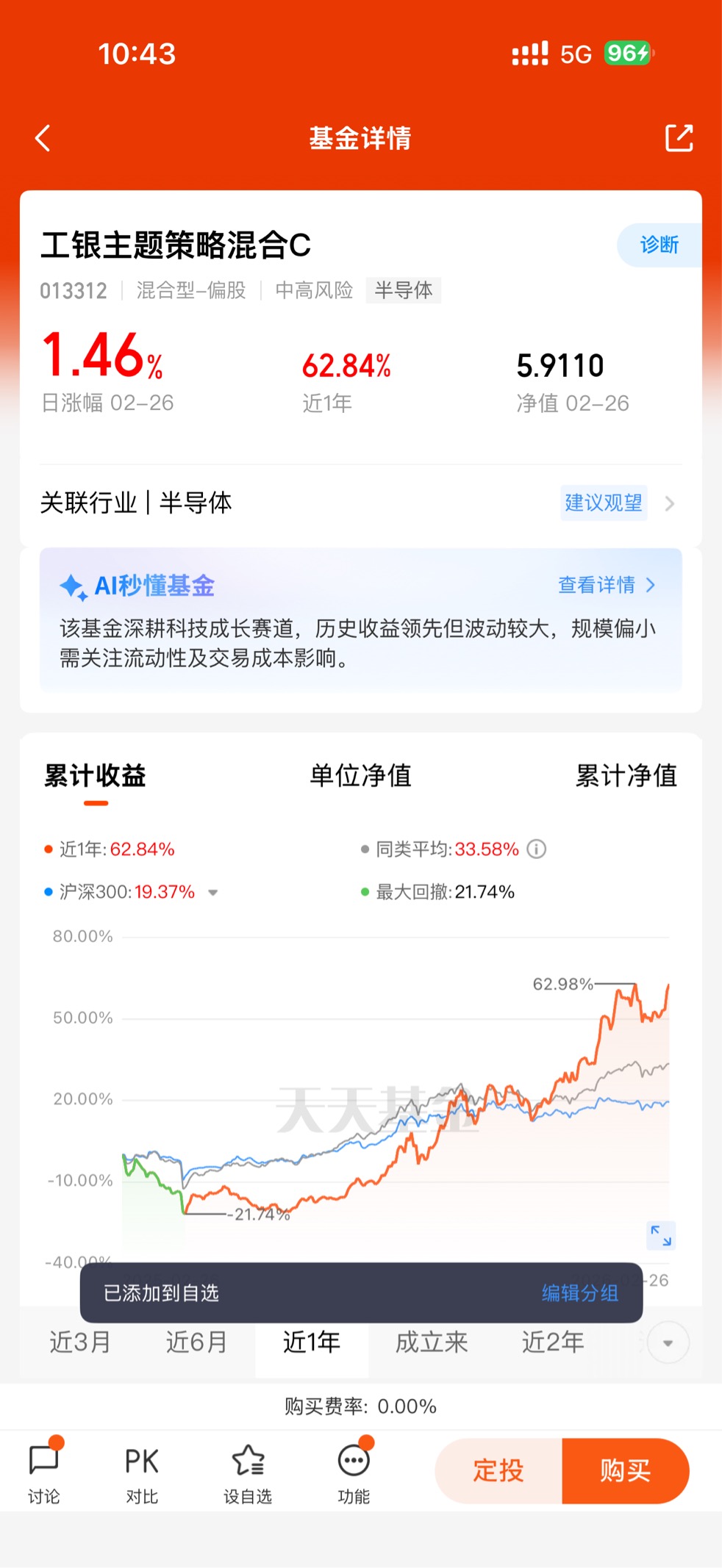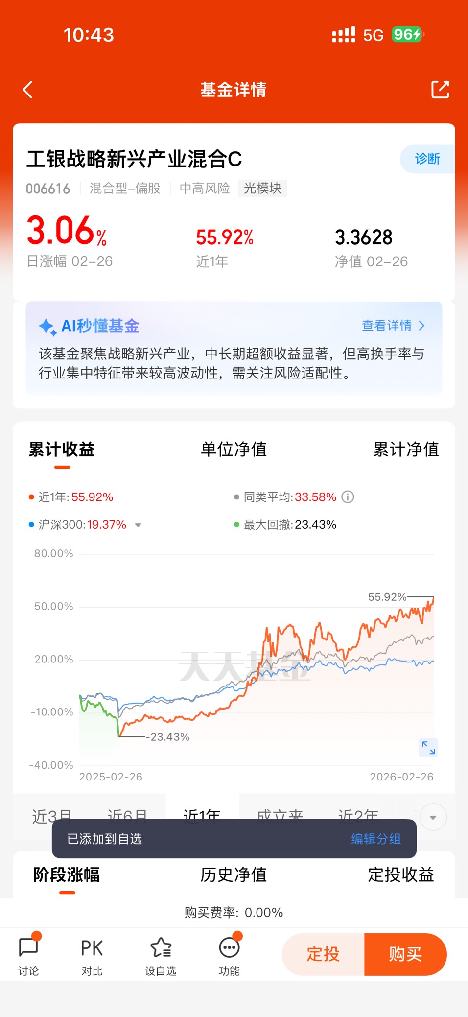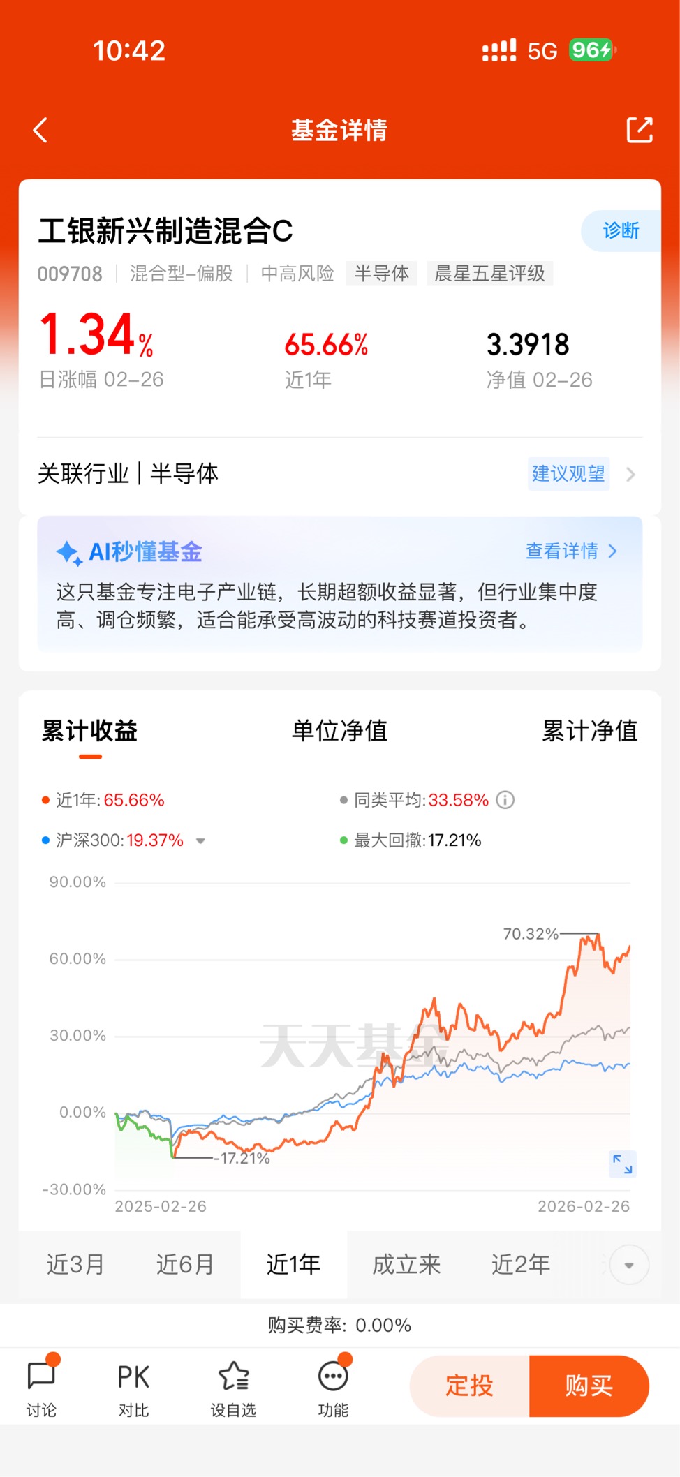 工银新兴制造混合C由工银瑞信基金管理,成立于2020年8月,当前由具备10年证券从业经验的马丽娜管理。基金定位新兴制造+科技硬件双主线,重点投向半导体、AI算力、先进设备、电子元件等高成长领域,紧扣“科技自立自强”与“制造升级”两大时代主题。作为C类份额,该基金申购零费率、按日计提销售服务费,更适合短期持有与波段操作,降低投资者交易成本,适配灵活配置需求。