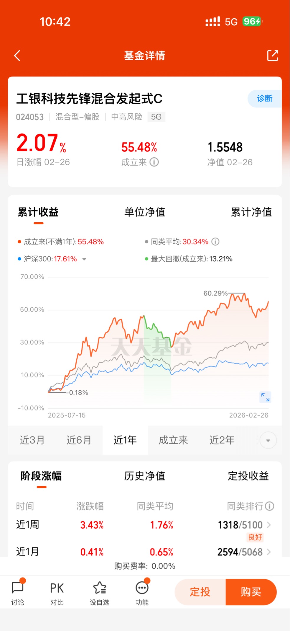 业绩层面,基金展现出强劲的进攻性与长期收益能力。截至2026年2月26日,基金最新净值3.3918,近1个月涨幅1.19%,近3个月涨幅29.04%,近6个月涨幅42.91%,近12个月涨幅高达65.66%,在同类偏股混合基金中表现突出。在科技板块波动加剧的市场环境中,基金依托产业深度研究与龙头集中策略,实现业绩领跑,印证了投资逻辑的有效性与管理人的选股能力。