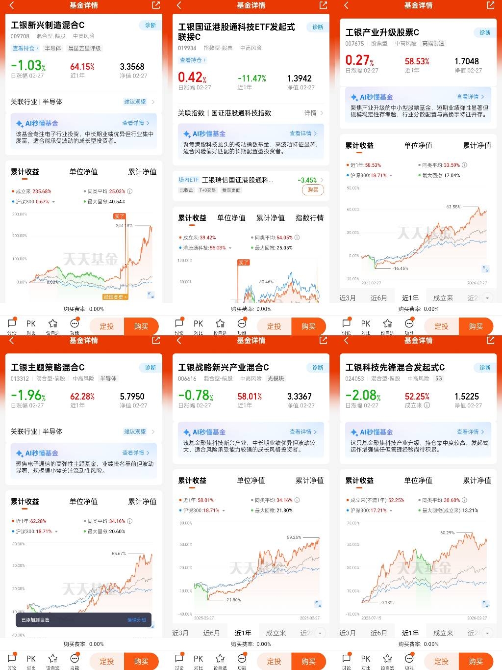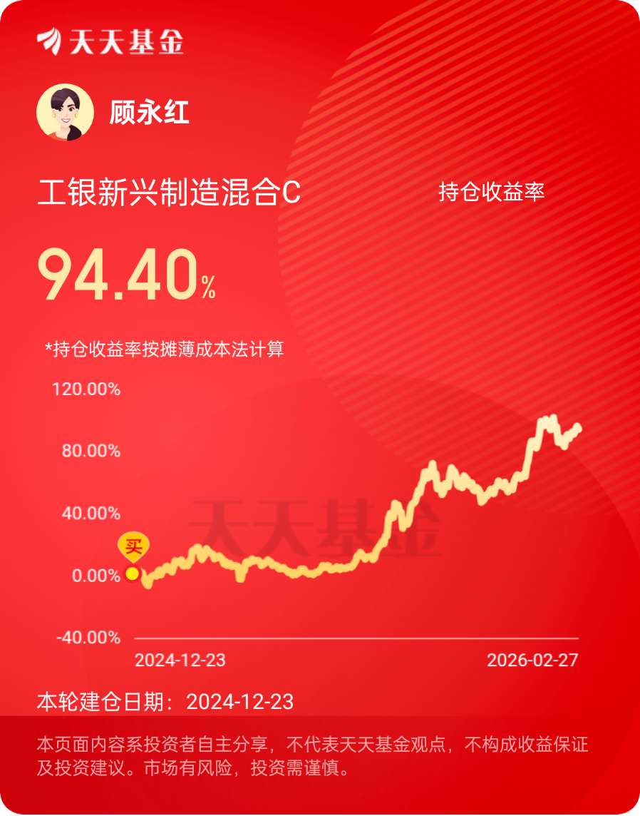 我追随工银瑞信基金20年了,目前定投持有十多只基金,包括工银新兴制造混合C、工银国证港股通科技ETF发起式联接C、工银新经济混合(QDII)人民币A、工银健康产业混合C、工银黄金ETF联接E、工银全球精选股票(QDII)等,对收益回报和持有体验感到非常满意!我会继续配置工银瑞信基金产品,坚持定投,坚定持有!@工银瑞信基金