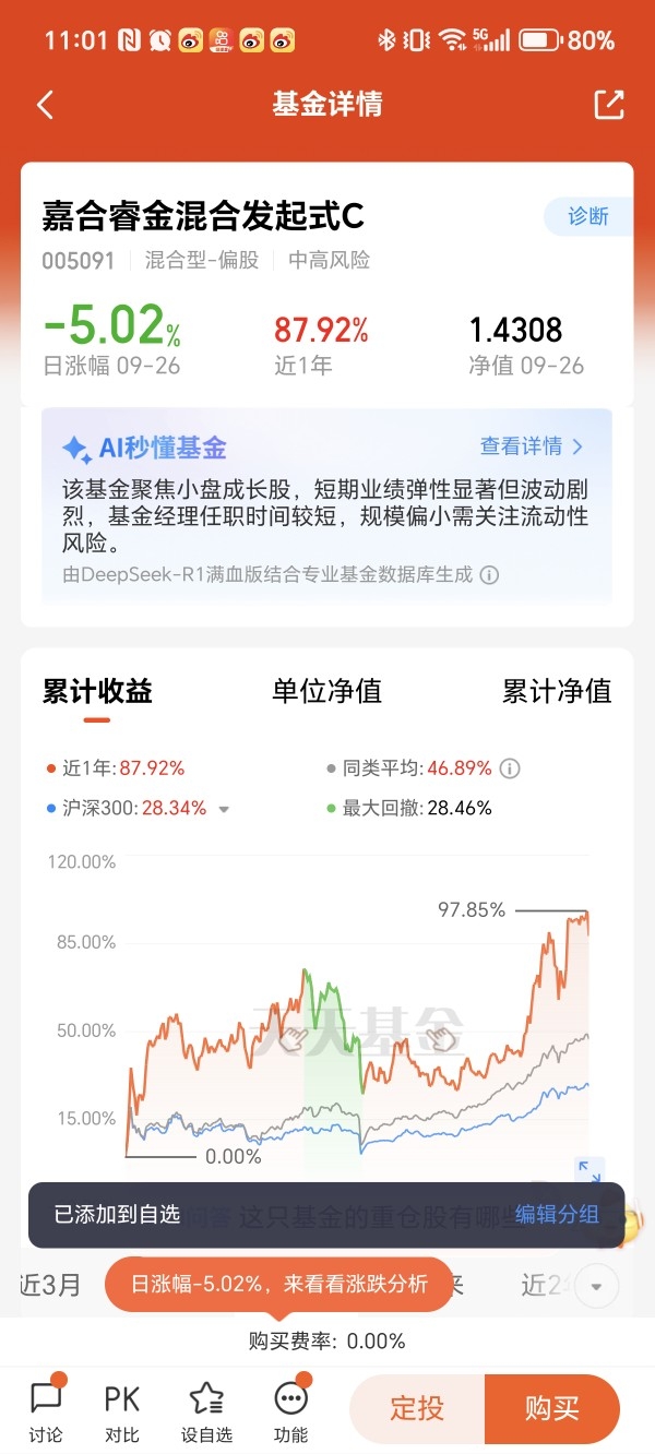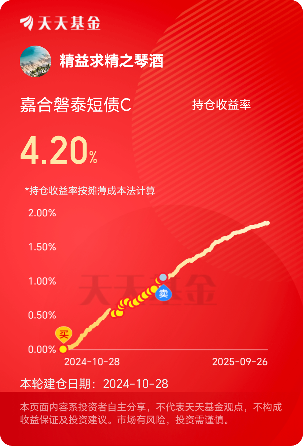 #分享国庆见闻,晒收益,瓜分好礼!# 国庆假期前,我习惯性地整理了下账户里的闲置资金,本打算就让它静静躺在活期里,却偶然发现了嘉合磐泰短债基金。抱着试试看的心态买入后,整个假期都没怎么管,回来查看时竟收获了一笔稳定的票息收益。