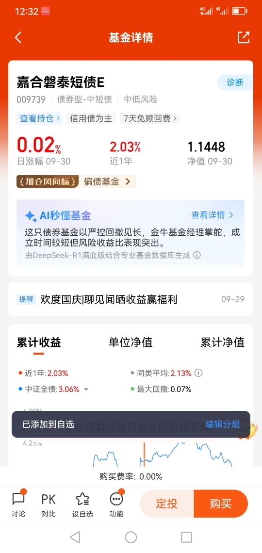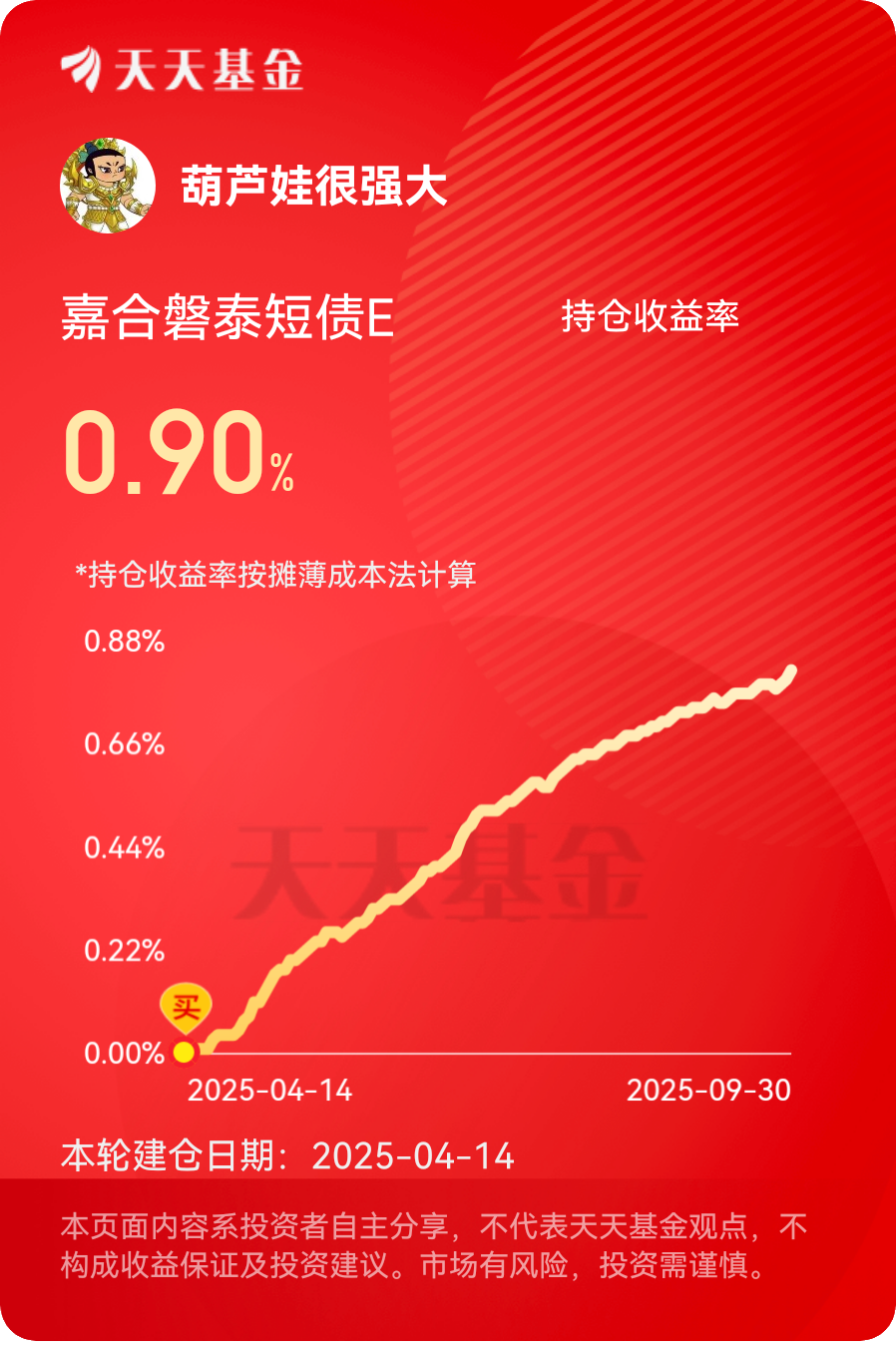 #分享国庆见闻,晒收益,瓜分好礼!# 上海的静安公园开发了一个新的景点,让全国各地的很多人都来打卡拍照,而我也不例外去了,这个景点与敦煌莫高窟很向,我已经连续去了三天,每一天都有不一样的新鲜感,而且我也发现大伙的消费热情挺高涨的。我的投资计划是买入一些债基,我是如此思考的:因为现在市场的无风险利率很低。另外,债券型基金的规模最近几年增长的很快,而越来越多的投资者对于债券型基金也是非常重视,所以它是很多家庭重要的资产配置之一。持有债基是可以带给我们投资者一种稳稳的幸福的感觉的,根据历史统计,从2014到2024年这10年,债基的平均收益率除了在2017年是负收益以外,在其他的9年都是正收益,而且债基的这10年的平均收益率是可以超过4.5%的,而且它的平均最大回撤率是没有超过2%的,这种缓缓上涨的走势是可以让我们投资者做到安心持有的。所以我拥抱了嘉合磐泰短债E(009739),我相信它在未来的表现会更加的出色。@嘉合基金