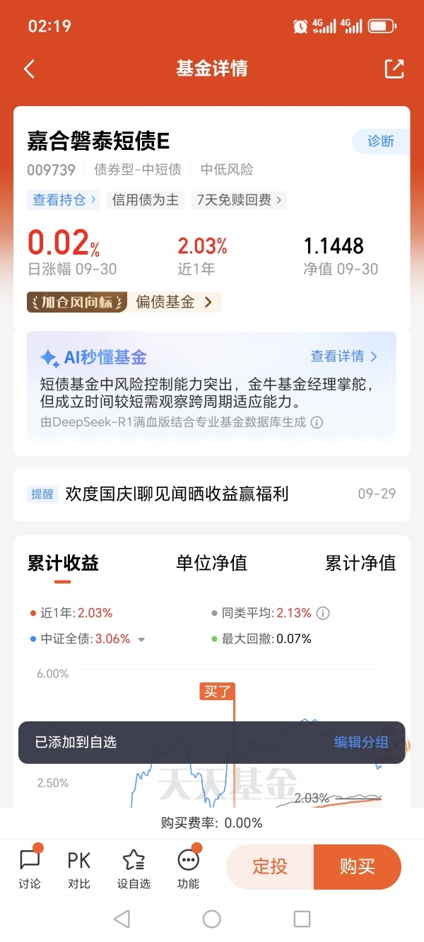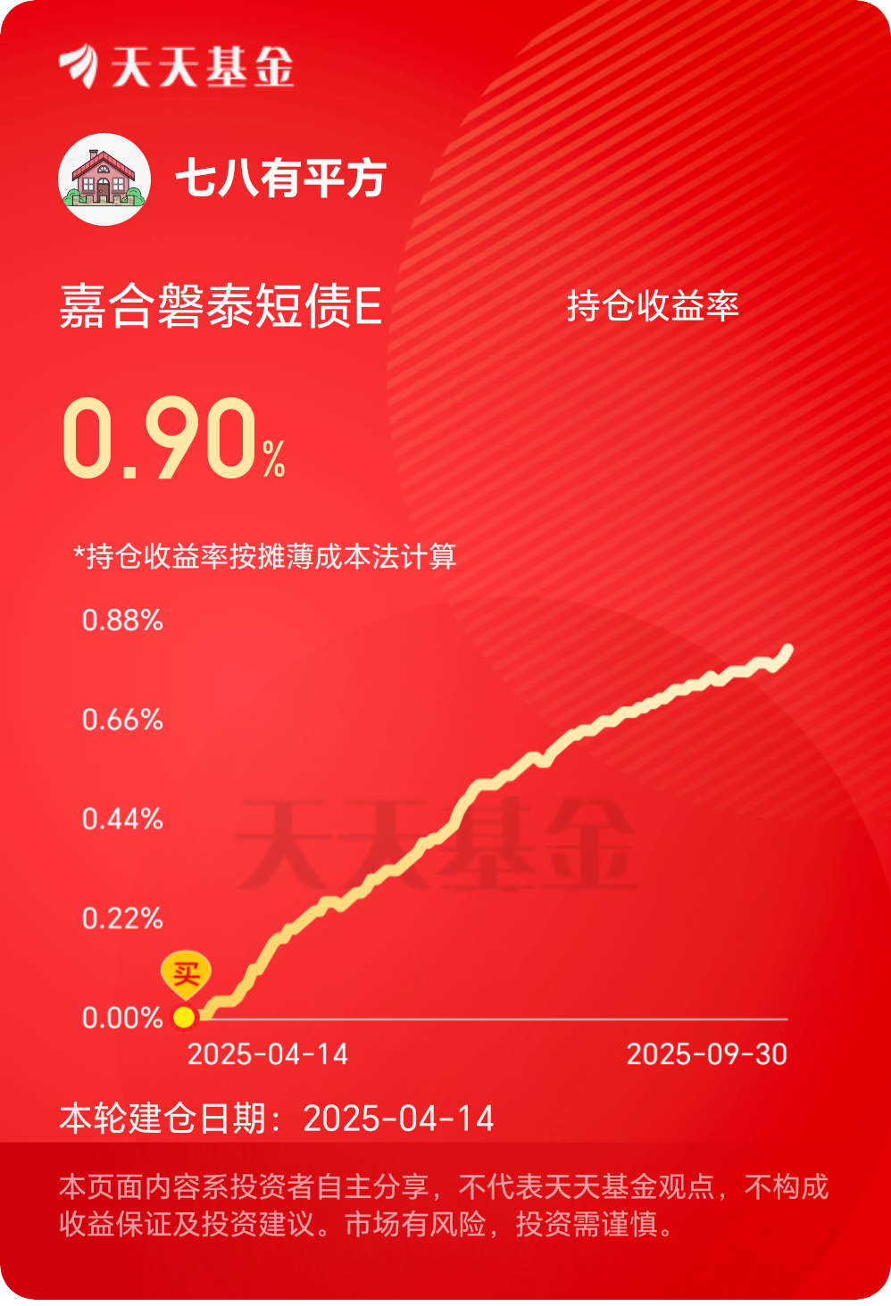 #分享国庆见闻,晒收益,瓜分好礼!# 国庆见闻:我与亲朋好友去了济南的英雄山风景区去游玩了,看了很多美景,尝了很多美食,在分享投资经验的时候,我们都发现了债基的重要性,所以我在天天基金平台上比较了很多款债基,我的选择条件是波动率要小,最好是投资短债的债基,我持有的是嘉合磐泰短债E(009739),因为它主要投资的是中短债,而且根据最新季报披露,它目前的前五大重仓债占它的总资产的比例仅为16.79%,这说明了于启明与叶平这两位基金经理的风控管理相当到位,而且它的长期净值表现是有目共睹的。@嘉合基金