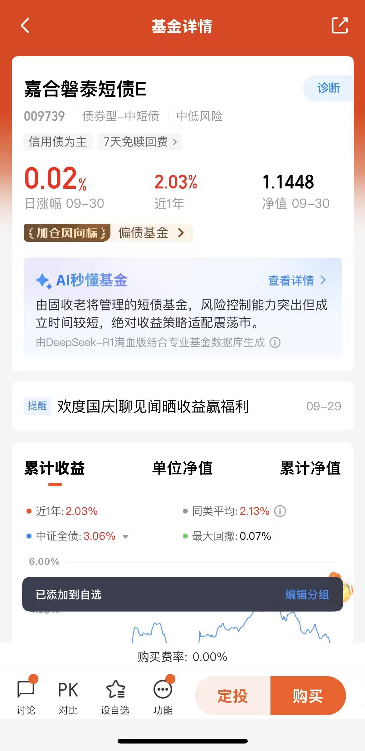 嘉合磐泰就是主投AAA级信用债的短债基金,无论我们是在9月29日还是9月30日的下午3点前购买,都可以享受10月1号至8号的长假收益,当然,如果我们在这之前没有购买,也可以在10月份购买,因为短债基金作为闲钱配置,具有流动性强,又比银行定期存款较高收益率的优点,如本基金近一年收益率2.03%,而同期银行一年期定存大概不到1%,风险程度也低,长假期间国际局势复杂,美国ZF关门、法国总理辞职等事件,可能会加剧市场不确定性,金价也连创新高,COMEX金已冲破4000美元/盎司,宜适当配置稳健型产品如短债基金。@嘉合基金