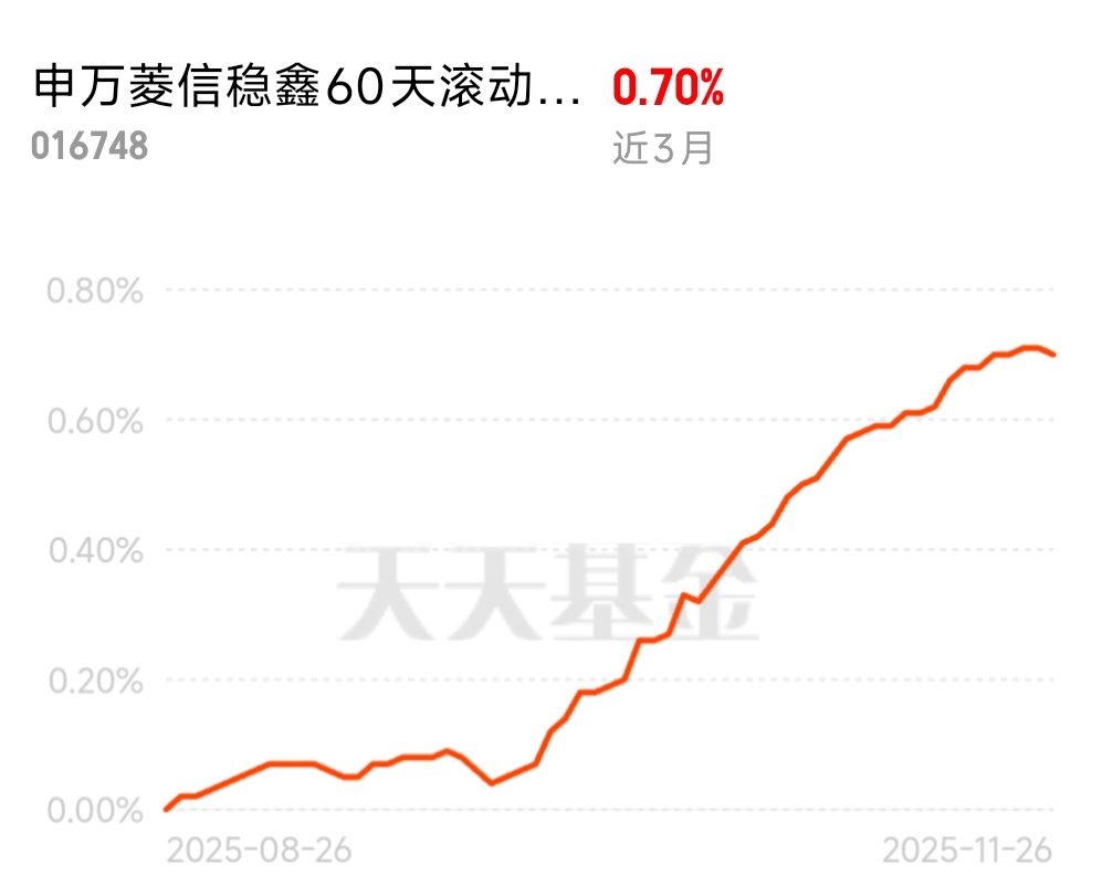 现在大家理财观念更理性,不再盲目追高收益,更看重本金安全,申万菱信稳鑫60天滚动持有中短债债券A近3个月收益0.70%,低风险高适配,适合各类稳健投资者。