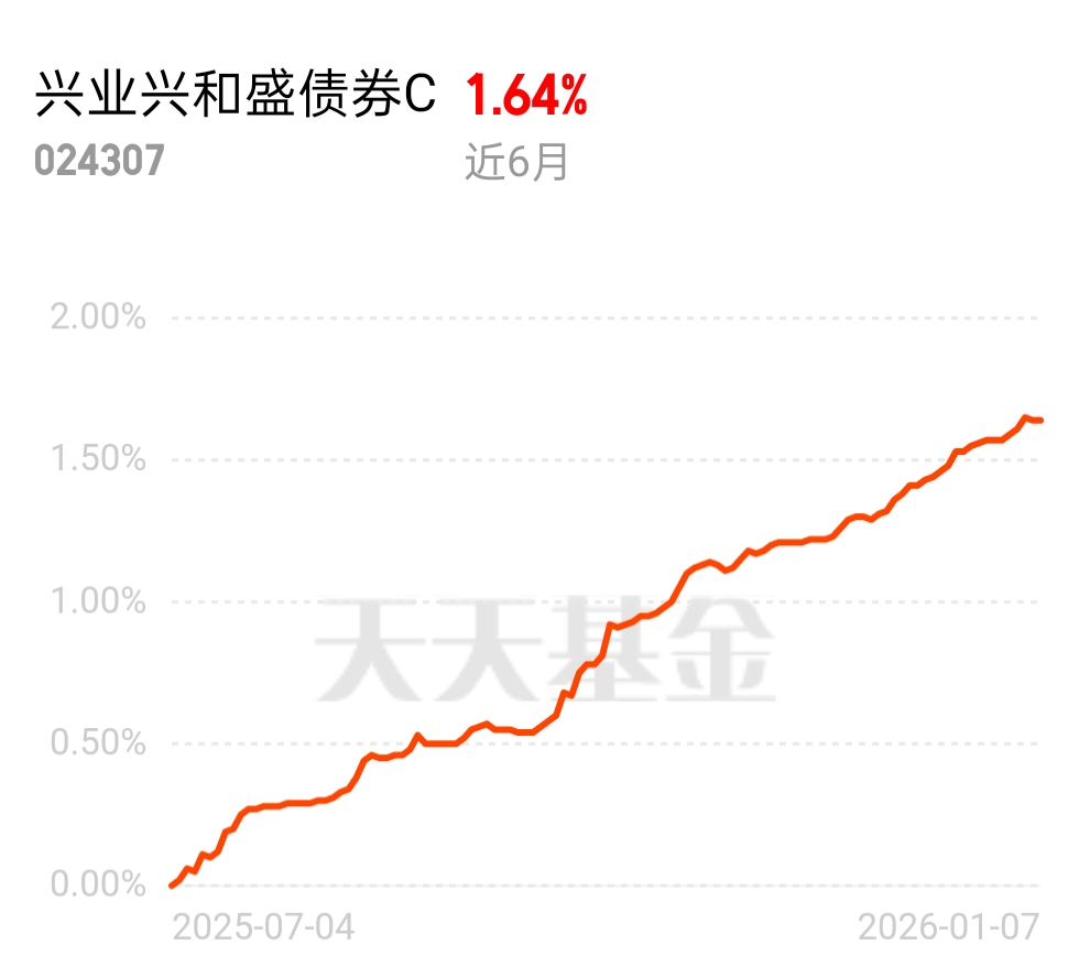 2026 年债市以更高利率起点开局,利率债波动让人揪心,最近利率债雨大,还是它稳。$兴业兴和盛债券C$ 近 6 月 1.64%,收益稳、波动小,不管市场怎么变,都能给你稳稳的回报。