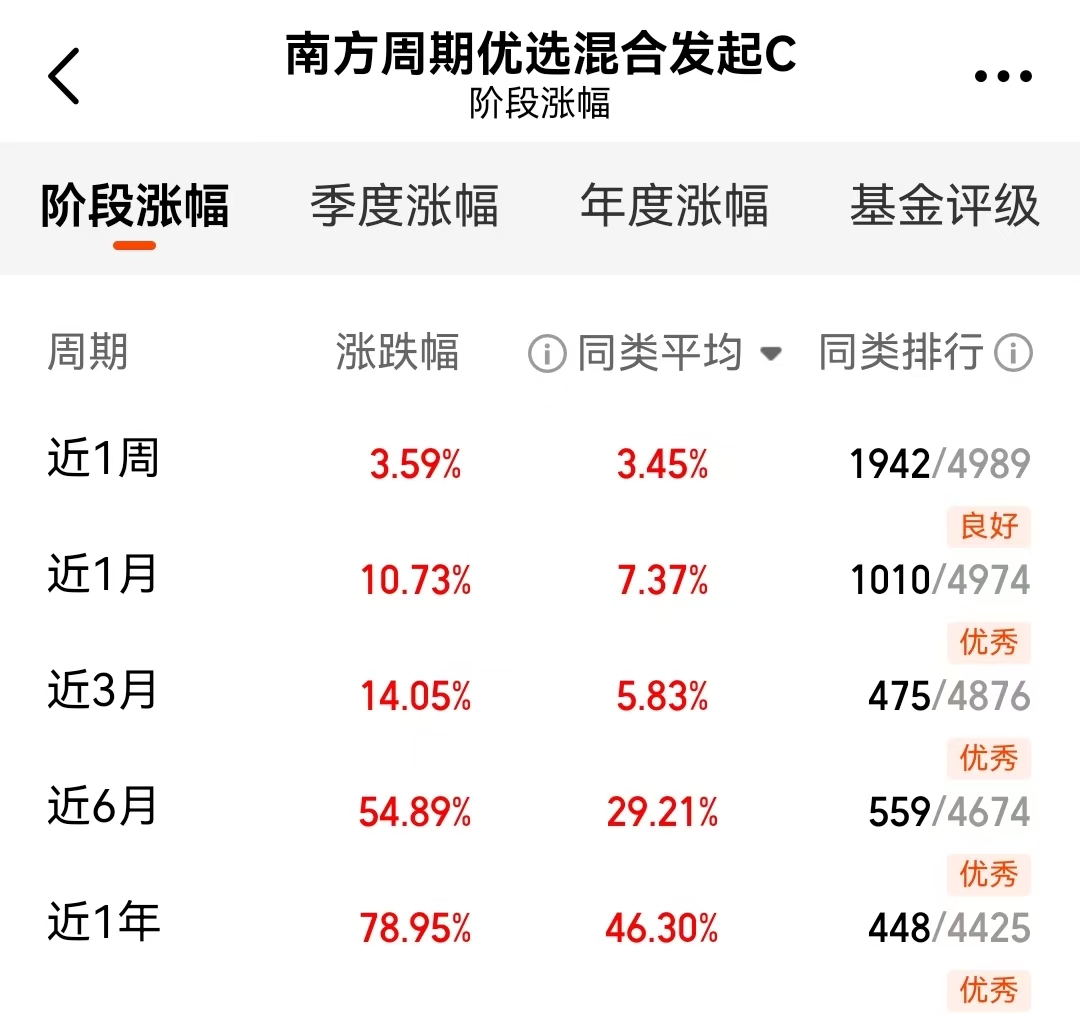 尽管A股今天有点震荡,但是$南方周期优选混合发起C$(021712)我今天预估它继续向好,我自己是已经买了一点。近一年它大概涨了80%,这种与实物资产关联紧密的产品,在当前环境下比较有优势。比如一些贵金属,除了传统的避险功能,在电子、医疗等新兴领域的应用也在增加。我觉着这类产品可以作为长期配置的一部分,不用太在意短期波动。#17连阳!A股日成交达3.6万亿元创历史新高#
