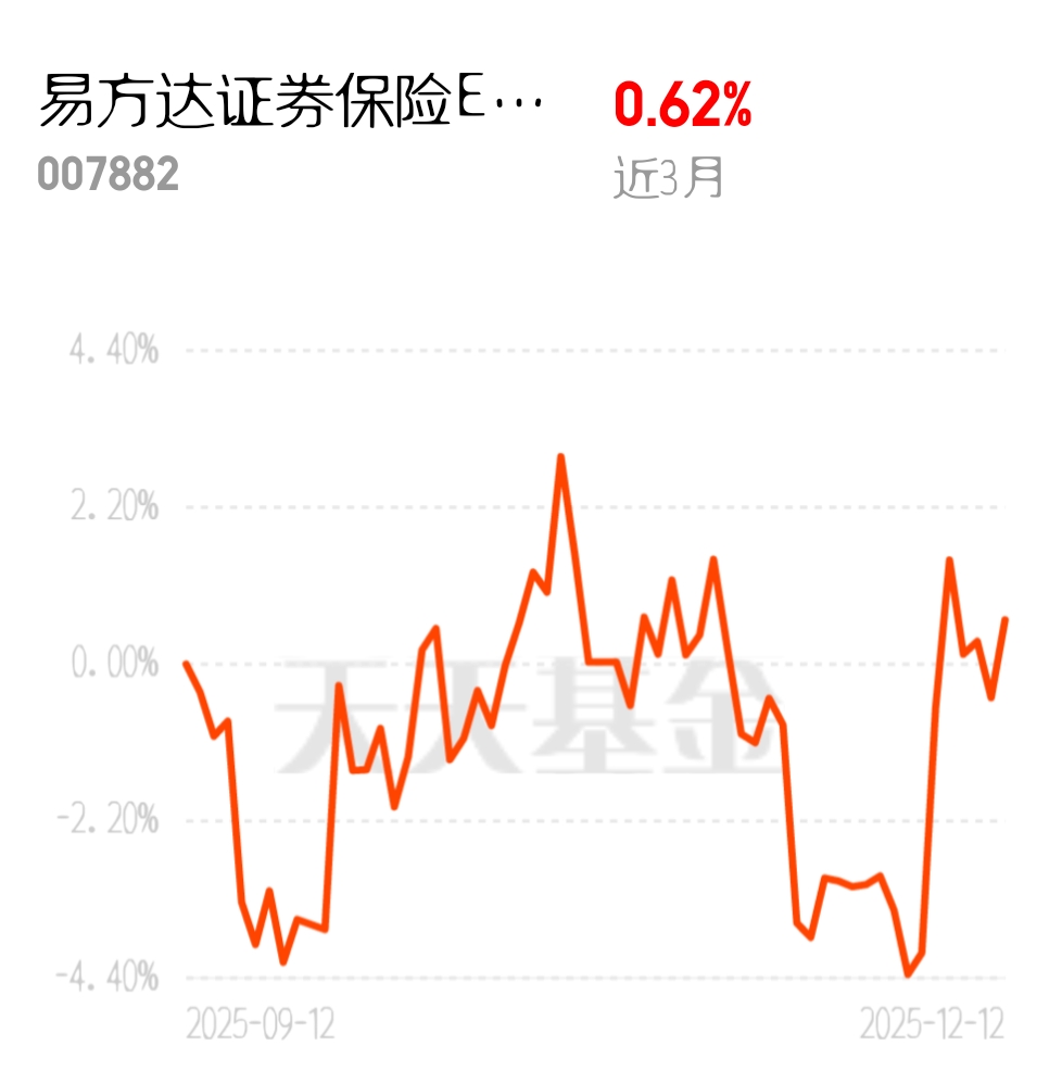 年末机构忙着资产再平衡,保险板块直接领涨两市,金融这类权重行业被带动得节节高。易方达证券保险 ETF 联接 C 近 3 月涨 0.62%,稳扎稳打跟着行业走,适合想稳妥布局的朋友。$易方达证券保险ETF联接C$