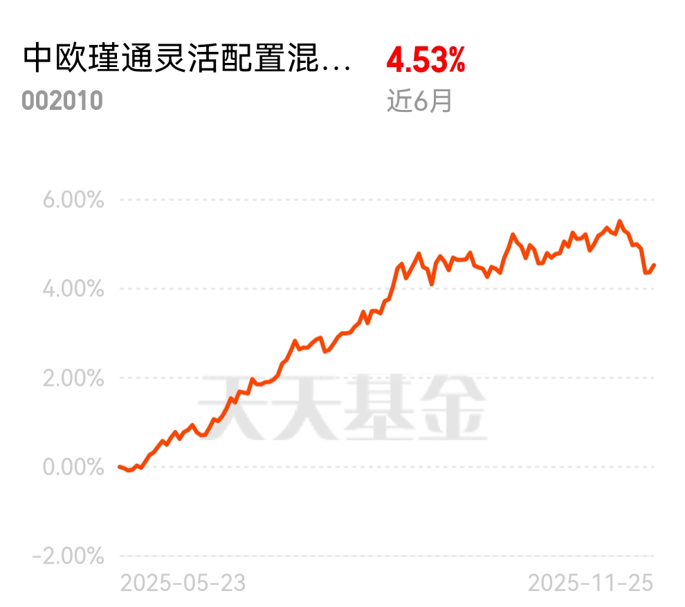 现在投资都讲究性价比和安全边际,那些波动大的高位板块让人不敢碰,稳健型产品越来越受欢迎。中欧瑾通灵活配置混合C近6个月收益4.53%,昨日净值+0.15%,“固收+”策略能对冲风险,稳稳当当赚收益,性价比超高。
