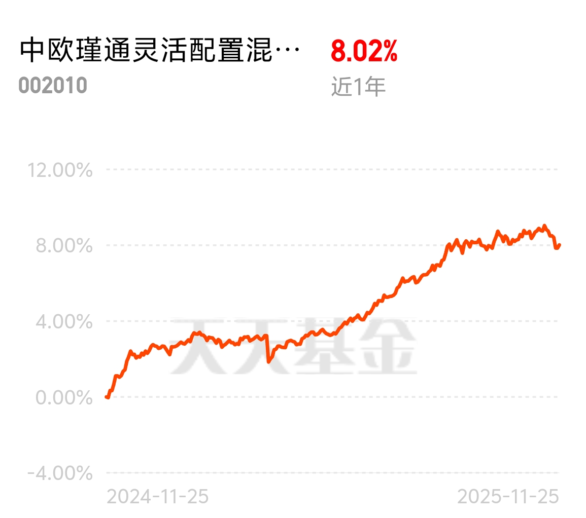 低利率环境下,传统理财收益上不去,权益市场又波动大,大家都面临“求稳难增利”的困境。中欧瑾通灵活配置混合C的“固收+”思路很靠谱,近1年收益8.02%,今天估算净值还涨了0.08%,平衡风险和收益超给力。