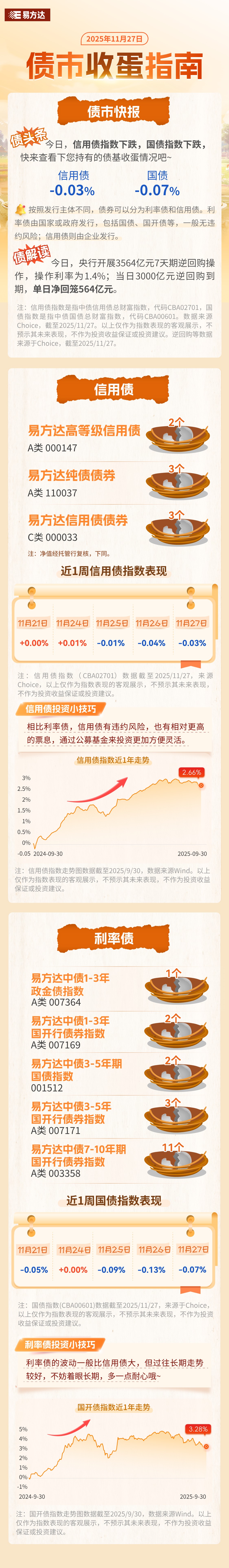 11月27日,信用债指数下跌、国债指数下跌,快来查看您持有的债基收蛋情况吧!