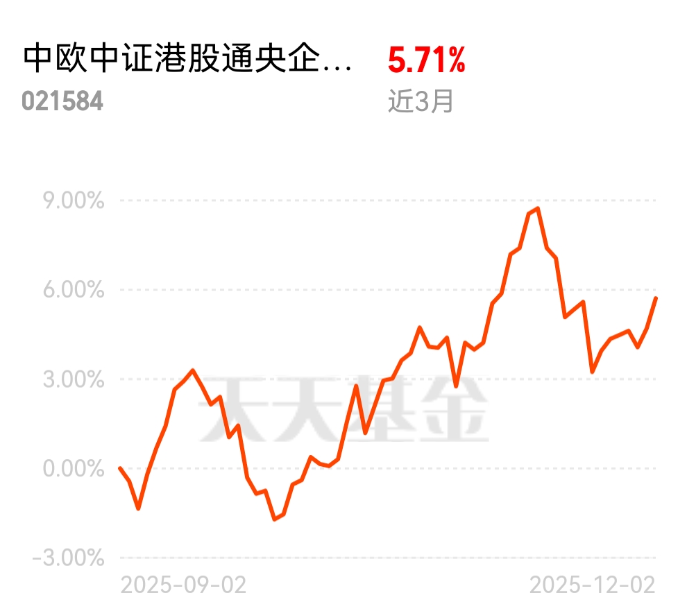 港股通央企红利指数估值处于历史低位,安全边际拉满,估值修复空间很大。中欧中证港股通央企红利指数发起 (QDII) C 近 3 个月 5.71%,高股息属性适配避险需求,安心持有不踩雷。