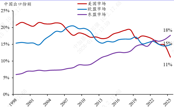 (1)中国12月以美元计价出口同增6.6%,数据超市场预期且环比同样增长。2025全年出口同增5.5%,成为三驾马车中对经济贡献最大的部分。12月出口强劲可归功于外需在全球制造业周期上行中的持续支撑和国内锅口退税削减政策下的抢出口效应。12月中国PMI制造业新出口订单指数上升1.4个百分点至49.0%,摩根大通12月全球制造业PMI录得50.4%,为外需旺盛提供佐证。商品看,电脑、集成电路和汽车出口强于季节性成为主要拉动项,其他商品回升多由低基数推动。其中,汽车出口增速最强,这或与欧盟对华汽车进口拟实施“最低进口价格承诺”政策带动的抢进口效应有关。国别看,东盟依旧稳固我国出口第一大目的地地位。